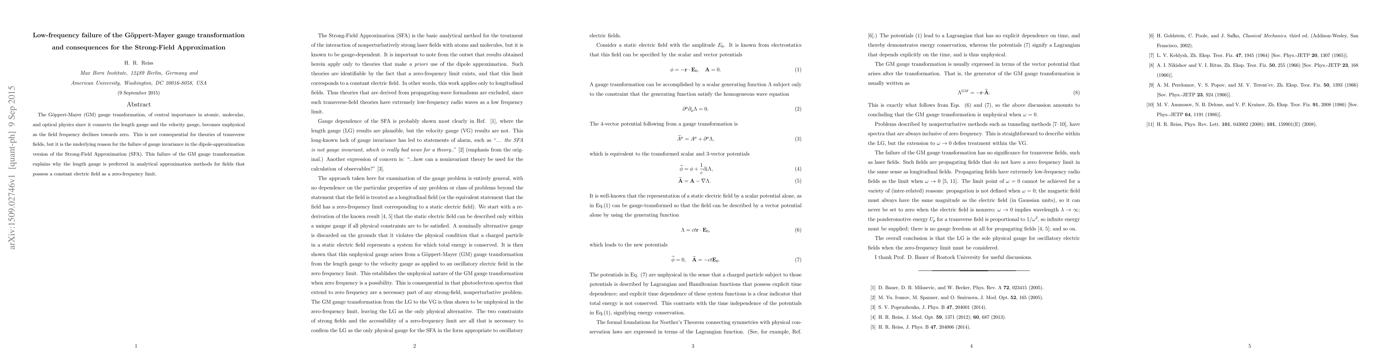 The G\"oppert-Mayer (GM) gauge transformation, of central importance in atomic, molecular, and optical physics since it connects the length gauge and the velocity gauge, becomes unphysical as the field frequency declines towards zero. This is not consequential for theories of transverse fields, but it is the underlying reason for the failure of gauge invariance in the dipole-approximation version of the Strong-Field Approximation (SFA). This failure of the GM gauge transformation explains why the length gauge is preferred in analytical approximation methods for fields that possess a constant electric field as a zero-frequency limit.
