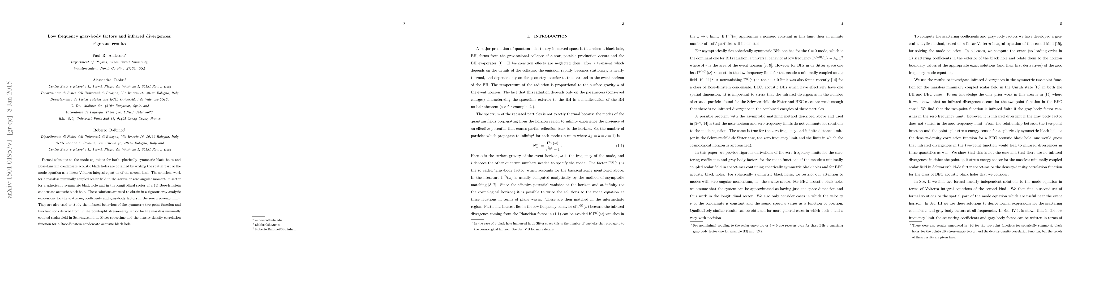 Formal solutions to the mode equations for both spherically symmetric black holes and Bose-Einstein condensate acoustic black holes are obtained by writing the spatial part of the mode equation as a linear Volterra integral equation of the second kind. The solutions work for a massless minimally coupled scalar field in the s-wave or zero angular momentum sector for a spherically symmetric black hole and in the longitudinal sector of a 1D Bose-Einstein condensate acoustic black hole. These solutions are used to obtain in a rigorous way analytic expressions for the scattering coefficients and gray-body factors in the zero frequency limit. They are also used to study the infrared behaviors of the symmetric two-point function and two functions derived from it: the point-split stress-energy tensor for the massless minimally coupled scalar field in Schwarzschild-de Sitter spacetime and the density-density correlation function for a Bose-Einstein condensate acoustic black hole.