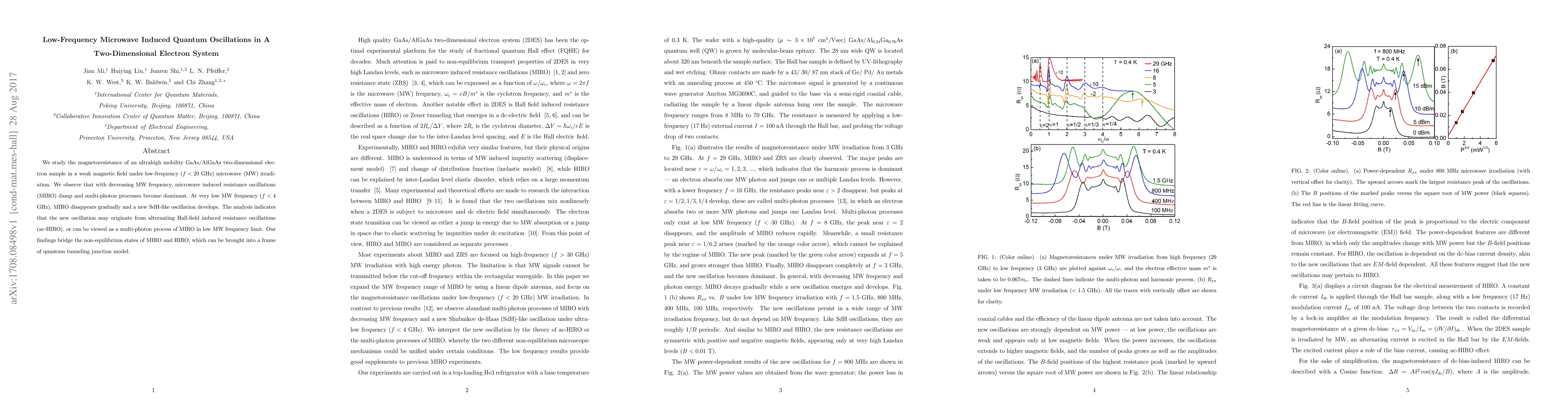 We study the magnetoresistance of an ultrahigh mobility GaAs/AlGaAs two-dimensional electron sample in a weak magnetic field under low-frequency (f < 20 GHz) microwave (MW) irradiation. We observe that with decreasing MW frequency, microwave induced resistance oscillations (MIRO) damp and multi-photon processes become dominant. At very low MW frequency (f < 4 GHz), MIRO disappears gradually and a new SdH-like oscillation develops. The analysis indicates that the new oscillation may originate from alternating Hall-field induced resistance oscillations (ac-HIRO), or can be viewed as a multi-photon process of MIRO in low MW frequency limit. Our findings bridge the non-equilibrium states of MIRO and HIRO, which can be brought into a frame of quantum tunneling junction model.
