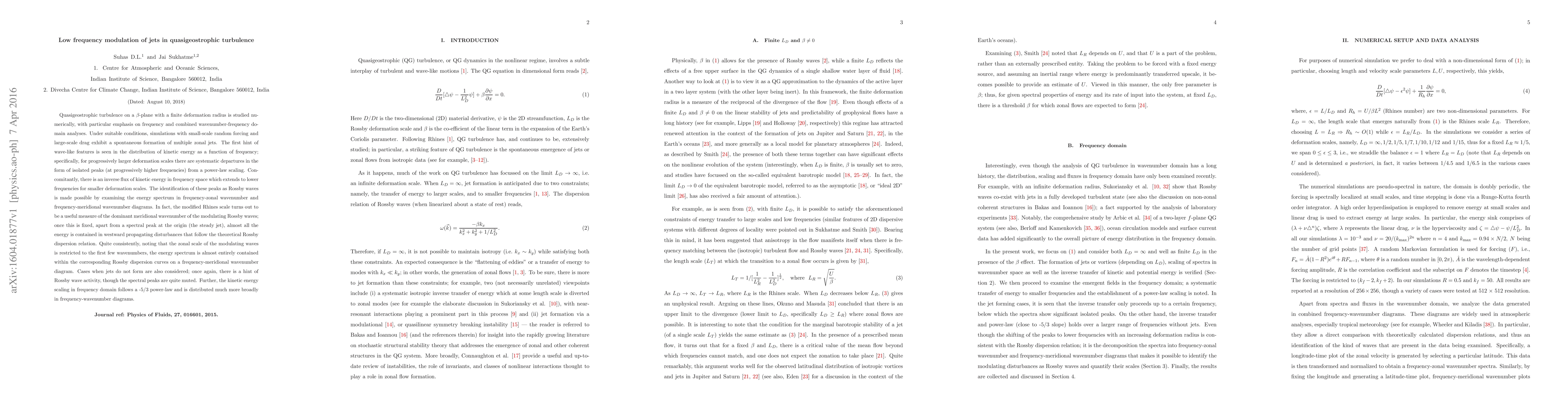 Quasigeostrophic turbulence on a beta-plane with a finite deformation radius is studied nu- merically, with particular emphasis on frequency and combined wavenumber-frequency do- main analyses. Under suitable conditions, simulations with small-scale random forcing and large-scale drag exhibit a spontaneous formation of multiple zonal jets. The first hint of wave-like features is seen in the distribution of kinetic energy as a function of frequency; specifically, for progressively larger deformation scales there are systematic departures in the form of isolated peaks (at progressively higher frequencies) from a power-law scaling. Con- comitantly, there is an inverse flux of kinetic energy in frequency space which extends to lower frequencies for smaller deformation scales. The identification of these peaks as Rossby waves is made possible by examining the energy spectrum in frequency-zonal wavenumber and frequency-meridional wavenumber diagrams. In fact, the modified Rhines scale turns out to be a useful measure of the dominant meridional wavenumber of the modulating Rossby waves; once this is fixed, apart from a spectral peak at the origin (the steady jet), almost all the energy is contained in westward propagating disturbances that follow the theoretical Rossby dispersion relation. Quite consistently, noting that the zonal scale of the modulating waves is restricted to the first few wavenumbers, the energy spectrum is almost entirely contained within the corresponding Rossby dispersion curves on a frequency-meridional wavenumber diagram. Cases when jets do not form are also considered; once again, there is a hint of Rossby wave activity, though the spectral peaks are quite muted. Further, the kinetic energy scaling in frequency domain follows a -5/3 power-law and is distributed much more broadly in frequency-wavenumber diagrams