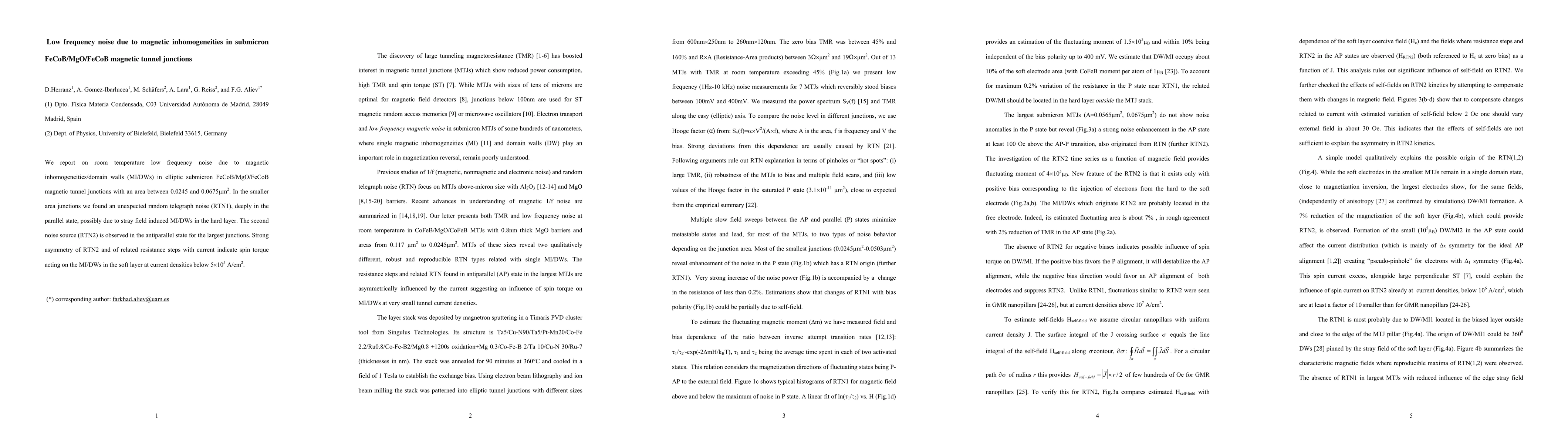This paper investigates low frequency noise in submicron FeCoB/MgO/FeCoB magnetic tunnel junctions, revealing two distinct random telegraph noise sources. Smaller junctions exhibit RTN1 noise in the parallel state, likely due to stray field-induced magnetic inhomogeneities. Larger junctions show RTN2 in the antiparallel state, with spin torque effects influencing magnetic domain walls at low current densities.