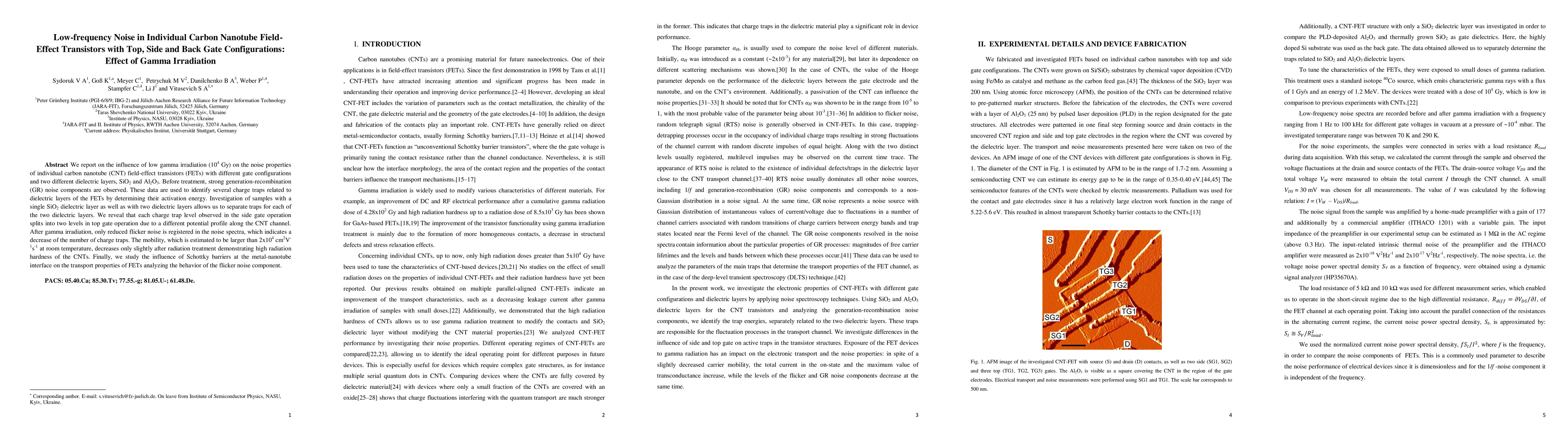 This study investigates the impact of gamma irradiation on low-frequency noise in carbon nanotube FETs with various gate configurations, revealing that gamma treatment reduces charge traps and slightly decreases mobility, showcasing the CNTs' radiation hardness. The analysis highlights differences in trap levels and noise components under different gate operations and dielectric layers.