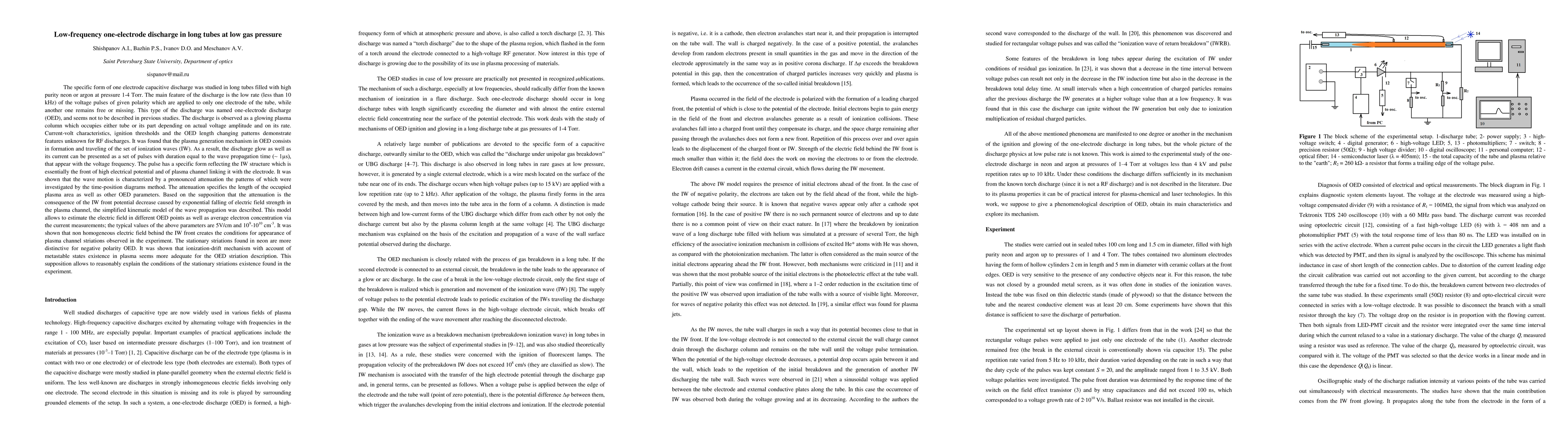 This paper investigates a novel low-frequency one-electrode discharge (OED) in long tubes at low gas pressure, characterized by low voltage pulse rates and unique plasma column formation. The study reveals the plasma generation mechanism through ionization waves and proposes a kinematic model for wave propagation, estimating electric field and electron concentration.