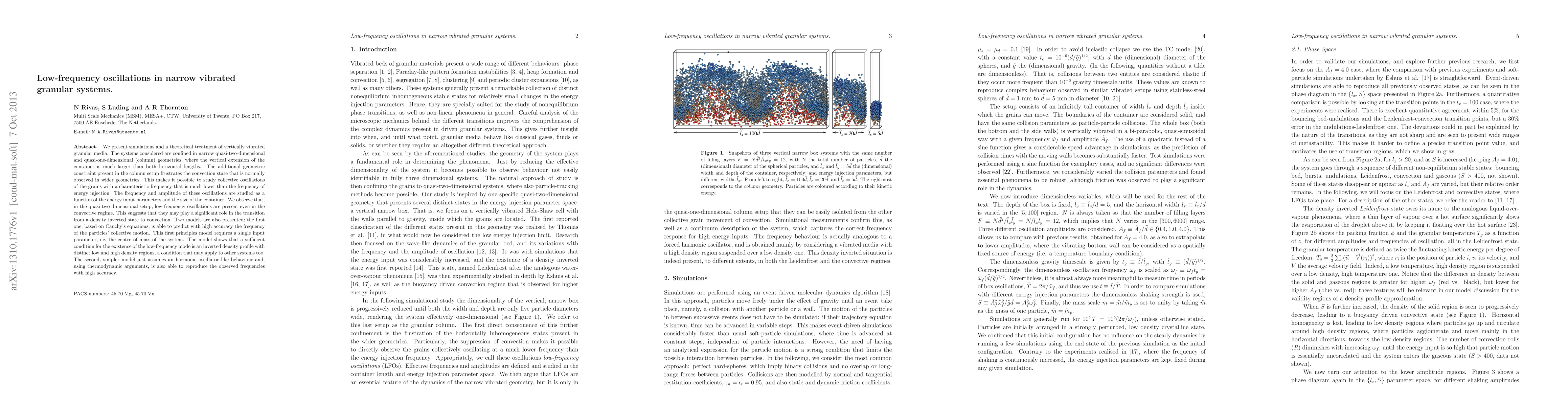 This paper investigates low-frequency oscillations in narrow vibrated granular systems confined in quasi-two-dimensional and quasi-one-dimensional geometries. It finds that these systems exhibit collective oscillations with frequencies much lower than the energy injection frequency, and proposes two models to accurately predict these oscillations.