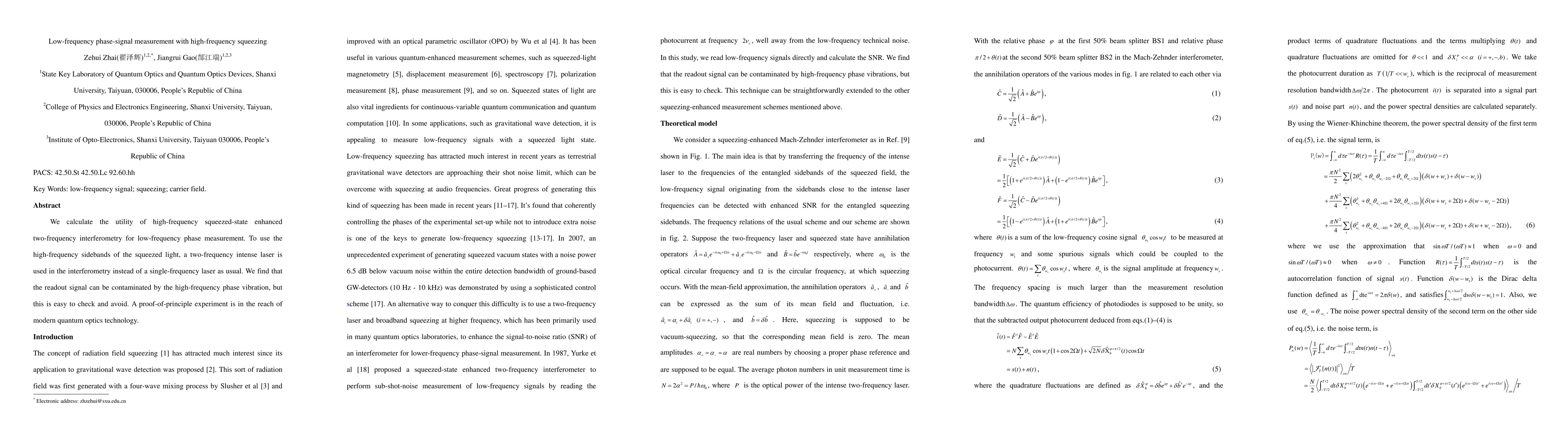Researchers demonstrate a method to measure low-frequency phases using high-frequency squeezed-state enhanced two-frequency interferometry, which allows for more precise measurements than traditional methods. This technique is within the reach of modern quantum optics technology.