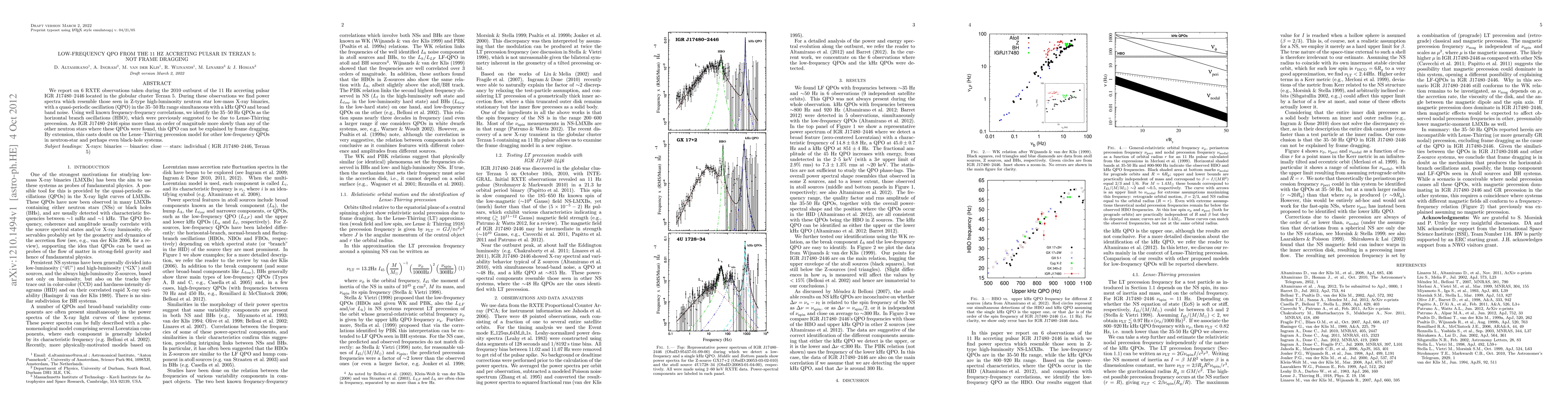 We report on 6 RXTE observations taken during the 2010 outburst of the 11 Hz accreting pulsar IGR J17480-2446 located in the globular cluster Terzan 5. During these observations we find power spectra which resemble those seen in Z-type high-luminosity neutron star low-mass X-ray binaries, with a quasi-periodic oscillation (QPO) in the 35-50 Hz range simultaneous with a kHz QPO and broad band noise. Using well known frequency-frequency correlations, we identify the 35-50 Hz QPOs as the horizontal branch oscillations (HBO), which were previously suggested to be due to Lense-Thirring precession. As IGR J17480-2446 spins more than an order of magnitude more slowly than any of the other neutron stars where these QPOs were found, this QPO can not be explained by frame dragging. By extension, this casts doubt on the Lense-Thirring precession model for other low-frequency QPOs in neutron-star and perhaps even black-hole systems.