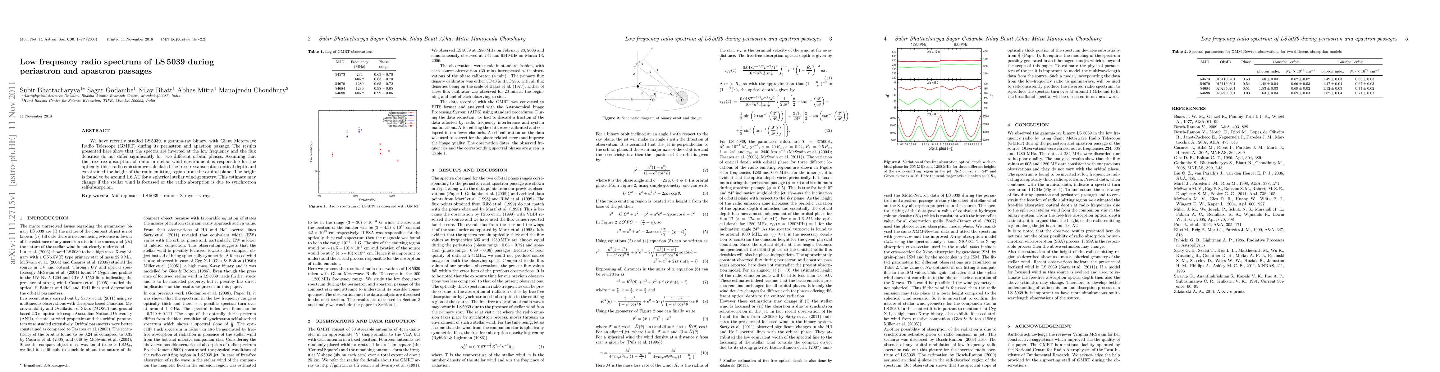 We have recently studied LS 5039, a gamma-ray binary, with Giant Meterwave Radio Telescope (GMRT) during its periastron and apastron passage. The results presented here show that the spectra are inverted at the low frequency and the flux densities do not differ significantly for two different orbital phases. Assuming that the free-free absorption of radio in stellar wind environment is responsible for the optically thick radio emission we calculated the free-free absorption optical depth and constrained the height of the radio emitting region from the orbital plane. The height is found to be around 1.6 AU for a spherical stellar wind geometry. This estimate may change if the stellar wind is focussed or the radio absorption is due to synchrotron self-absorption.