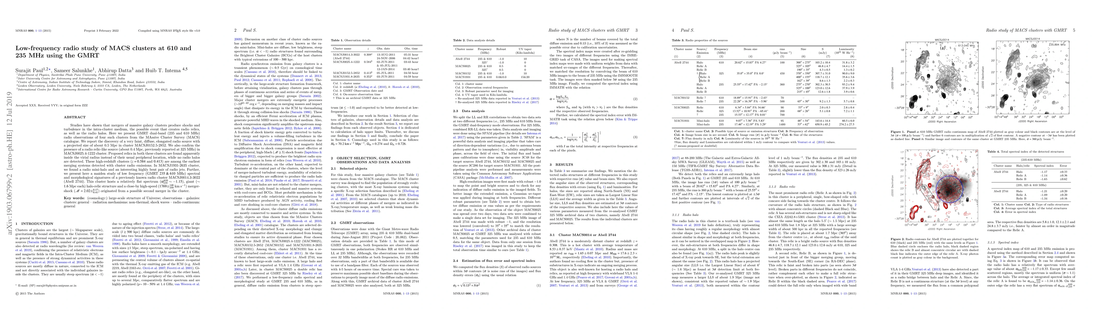 Studies have shown that mergers of massive galaxy clusters produce shocks and turbulence in the intra-cluster medium, the possible event that creates radio relics, as well as the radio halos. Here we present GMRT dual-band (235 and 610~MHz) radio observations of four such clusters from the MAssive Cluster Survey (MACS) catalogue. We report the discovery of a very faint, diffuse, elongated radio source with a projected size of about 0.5~Mpc in cluster MACSJ0152.5-2852. We also confirm the presence of a radio relic-like source (about 0.4~Mpc, previously reported at 325~MHz) in MACSJ0025.4-1222 cluster. Proposed relics in both these clusters are found apparently inside the virial radius instead of their usual peripheral location, while no radio halos are detected. These high-redshift clusters ($z=0.584$ and $0.413$) are among the earliest merging systems detected with cluster radio emissions. In MACSJ1931-2635 cluster, we found a radio mini-halo and an interesting highly bent pair of radio jets. Further, we present here a maiden study of low frequency (GMRT $235\;\&\;610$~MHz) spectral and morphological signatures of a previously known radio cluster MACSJ0014.3-3022 (Abell~2744). This cluster hosts a relatively flat spectrum ($\alpha^{610}_{235}\sim -1.15$), giant ($\sim 1.6$~Mpc each) halo-relic structure and a close-by high-speed ($1769\pm^{148}_{359}$~km~s$^{-1}$) merger-shock ($\mathcal{M}=2.02\pm^{0.17}_{0.41}$) originated from a possible second merger in the cluster.