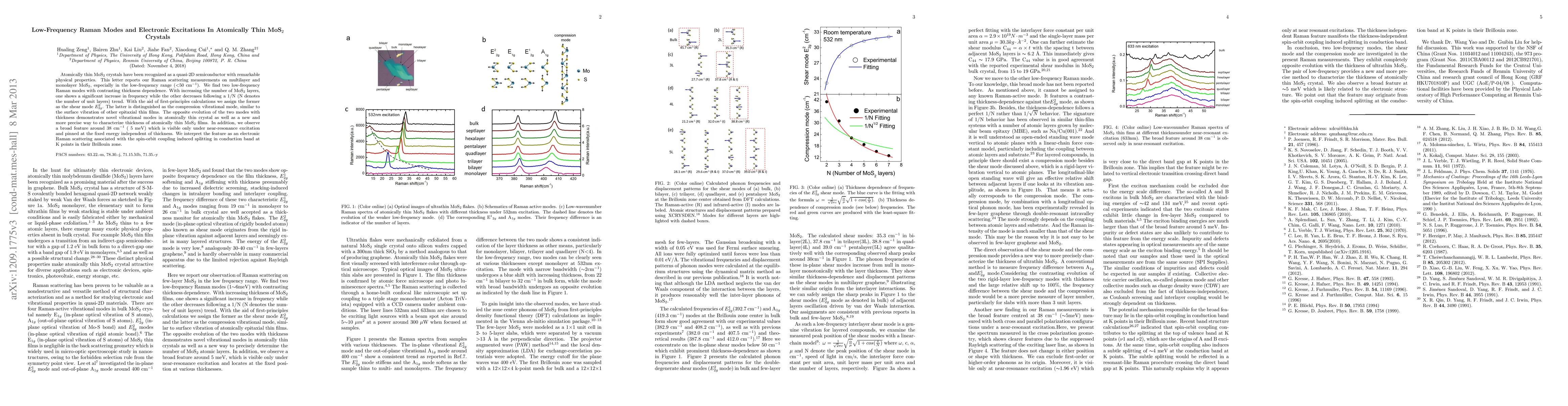 This study investigates low-frequency Raman modes in multilayer and monolayer MoS₂ crystals, identifying distinct thickness-dependent behaviors in two modes and attributing them to shear and compression vibrations. It also observes a near-resonance excitation feature linked to spin-orbit coupling in the conduction band.