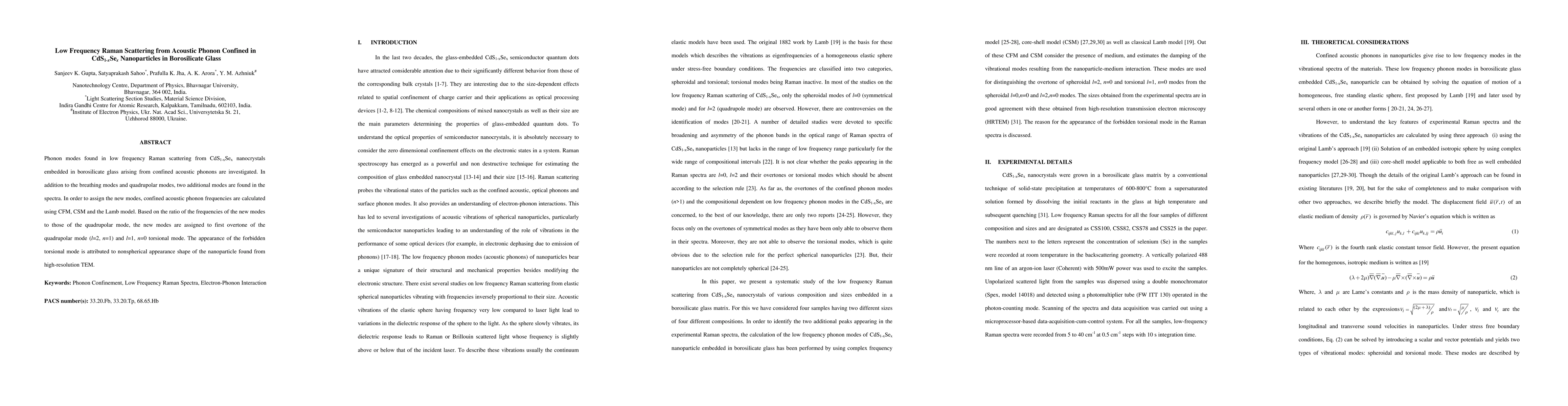 Phonon modes found in low frequency Raman scattering from $CdS_{1-x}Se_x$ nanocrystals embedded in borosilicate glass arising from confined acoustic phonons are investigated. In addition to the breathing modes and quadrupolar modes, two additional modes are found in the spectra. In order to assign the new modes, confined acoustic phonon frequencies are calculated using CFM, CSM and the Lamb model. Based on the ratio of the frequencies of the new modes to those of the quadrupolar mode, the new modes are assigned to first overtone of the quadrupolar mode (l=2, n=1) and l=1, n=0 torsional mode. The appearance of the forbidden torsional mode is attributed to nonspherical appearance shape of the nanoparticle found from high-resolution TEM.