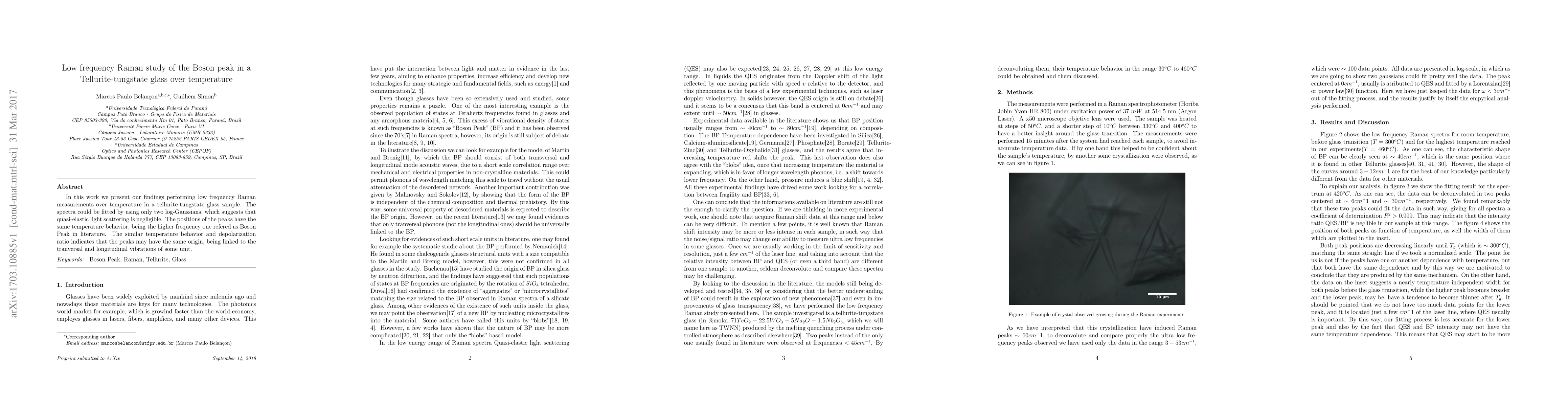 In this work we present our findings performing low frequency Raman measurements over temperature in a tellurite-tungstate glass sample. The spectra could be fitted by using only two log-Gaussians, which suggests that quasi-elastic light scattering is negligible. The positions of the peaks have the same temperature behavior, being the higher frequency one refered as Boson Peak in literature. The similar temperature behavior and depolarization ratio indicates that the peaks may have the same origin, being linked to the tranversal and longitudinal vibrations of some unit.