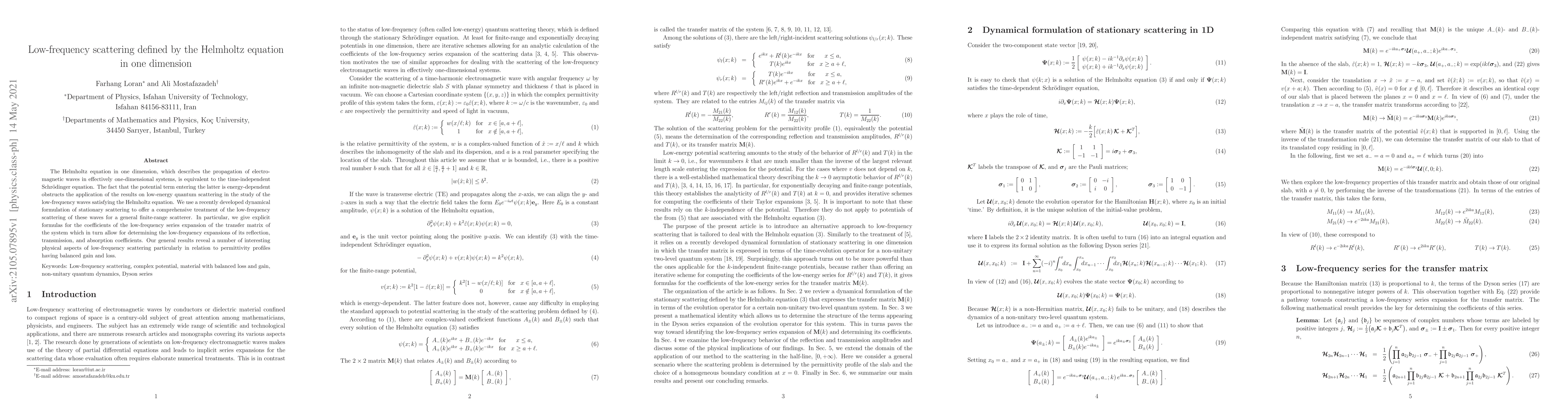 This paper explores low-frequency scattering governed by the one-dimensional Helmholtz equation, equivalent to the time-independent Schrödinger equation. It provides explicit formulas for the low-frequency series expansion of the transfer matrix, revealing physical insights into scattering phenomena, particularly for systems with balanced gain and loss profiles.