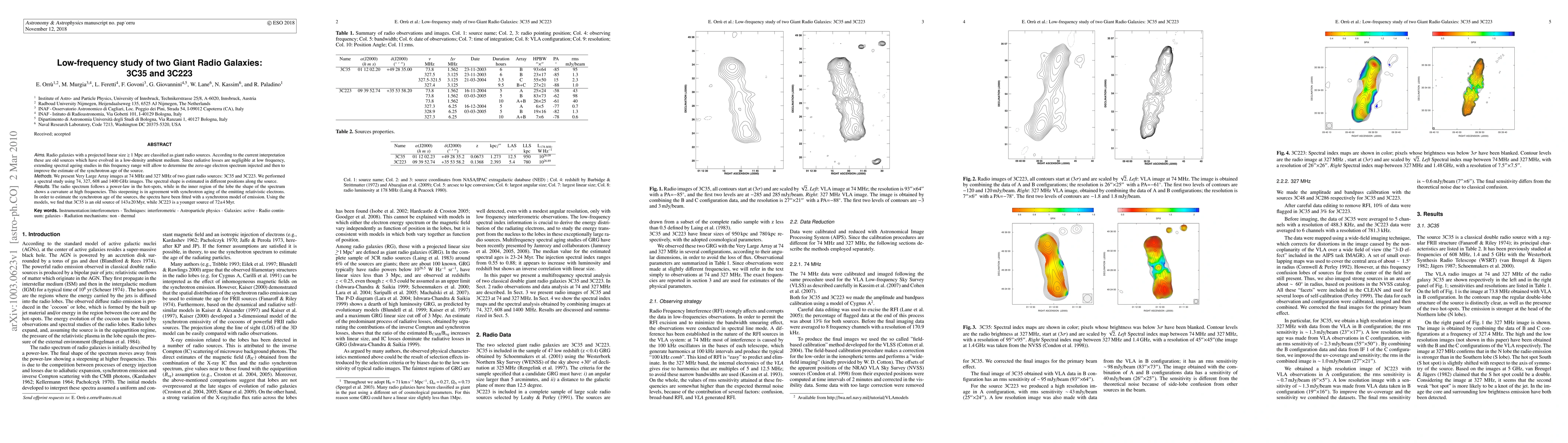 Radio galaxies with a projected linear size > 1 Mpc are classified as giant radio sources. According to the current interpretation these are old sources which have evolved in a low-density ambient medium. Since radiative losses are negligible at low frequency, extending spectral ageing studies in this frequency range will allow to determine the zero-age electron spectrum injected and then to improve the estimate of the synchrotron age of the source. We present Very Large Array images at 74 MHz and 327 MHz of two giant radio sources: 3C35 and 3C223. We performed a spectral study using 74, 327, 608 and 1400 GHz images. The spectral shape is estimated in different positions along the source. The radio spectrum follows a power-law in the hot-spots, while in the inner region of the lobe the shape of the spectrum shows a curvature at high frequencies. This steepening is in agreement with synchrotron aging of the emitting relativistic electrons. In order to estimate the synchrotron age of the sources, the spectra have been fitted with a synchrotron model of emission. Using the models, we find that 3C35 is an old source of about 143 Myr, while 3C223 is a younger source of 72 Myr.