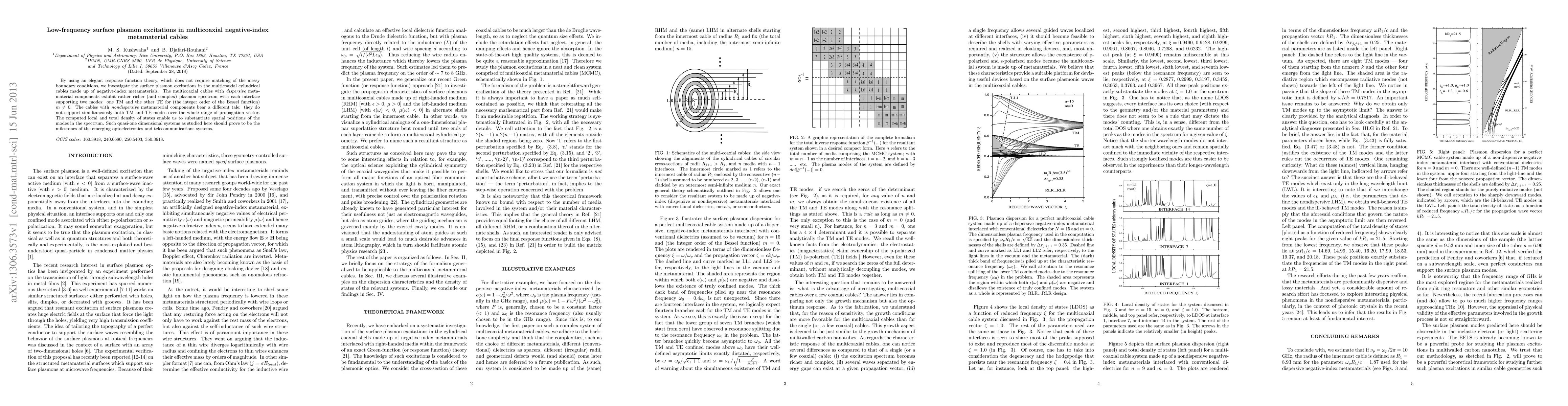 By using an elegant response function theory, which does not require matching of the messy boundary conditions, we investigate the surface plasmon excitations in the multicoaxial cylindrical cables made up of negative-index metamaterials. The multicoaxial cables with {\em dispersive} metamaterial components exhibit rather richer (and complex) plasmon spectrum with each interface supporting two modes: one TM and the other TE for (the integer order of the Bessel function) $m \ne 0$. The cables with {\em nondispersive} metamaterial components bear a different tale: they do not support simultaneously both TM and TE modes over the whole range of propagation vector. The computed local and total density of states enable us to substantiate spatial positions of the modes in the spectrum. Such quasi-one dimensional systems as studied here should prove to be the milestones of the emerging optoelectronics and telecommunications systems.