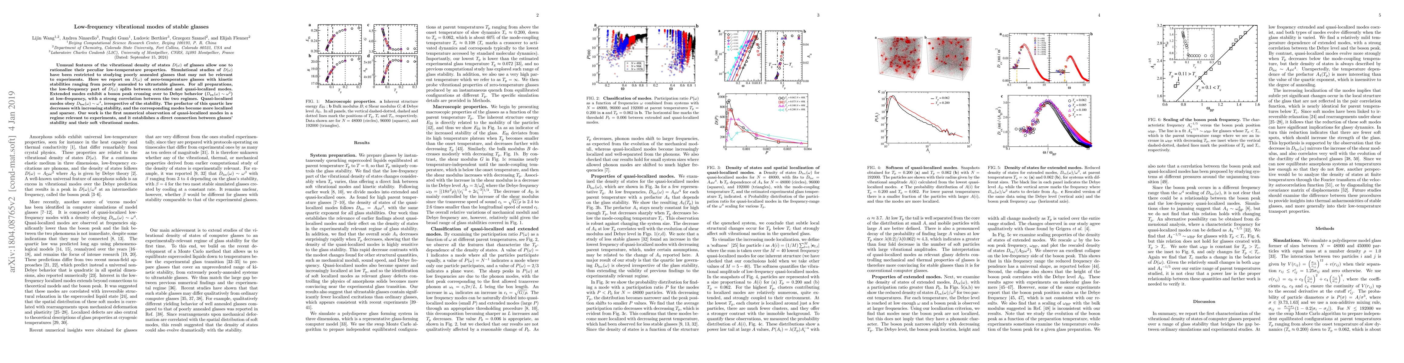 This paper numerically investigates the vibrational density of states in glasses of varying kinetic stability, revealing a split between extended and quasi-localized low-frequency modes. The extended modes show a boson peak transitioning to Debye behavior, while quasi-localized modes follow a quartic law, with their prefactor decreasing in more stable glasses, indicating more localized and sparse modes.