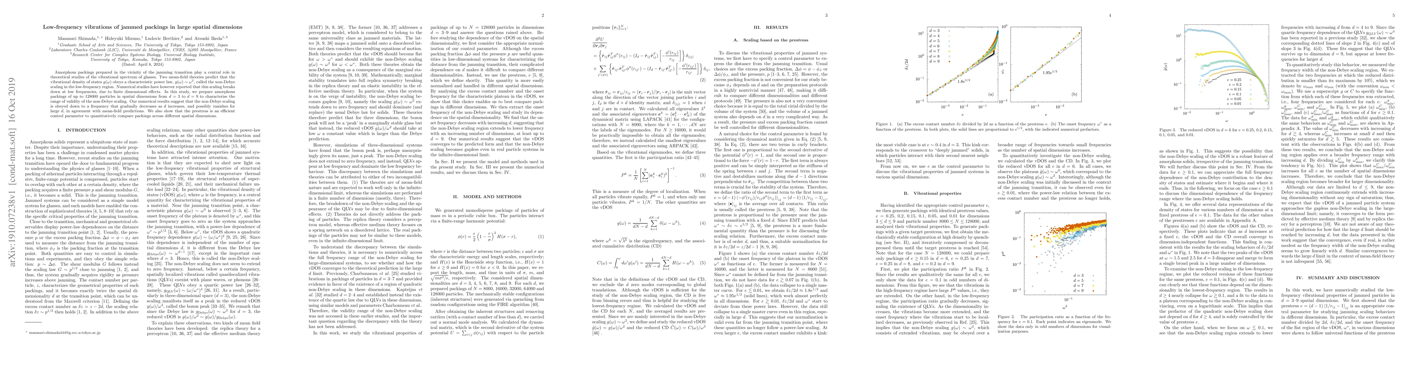 This paper investigates the low-frequency vibrational behavior of jammed amorphous packings across spatial dimensions from $d=3$ to $d=9$, finding that the non-Debye scaling holds down to a frequency that decreases with increasing dimension, supporting mean-field theories. Prestress emerges as a useful parameter for comparing packings across different dimensions.
