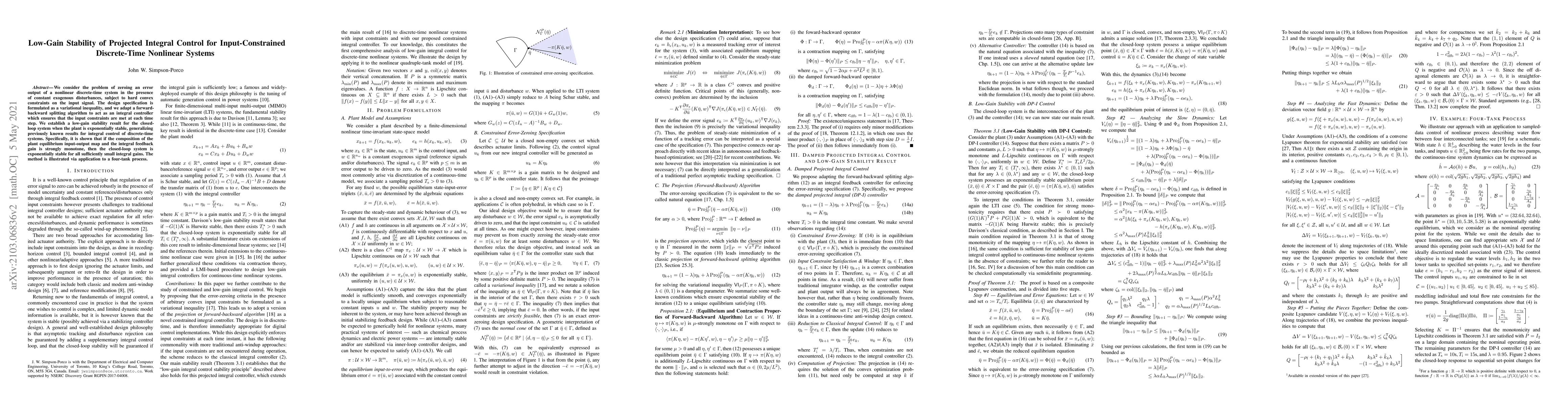 This paper investigates the low-gain stability of projected integral control for input-constrained nonlinear discrete-time systems, adapting a forward-backward splitting algorithm to ensure input constraints. It establishes a low-gain stability result for exponentially stable systems under certain monotonicity conditions, and demonstrates the method through a four-tank process application.