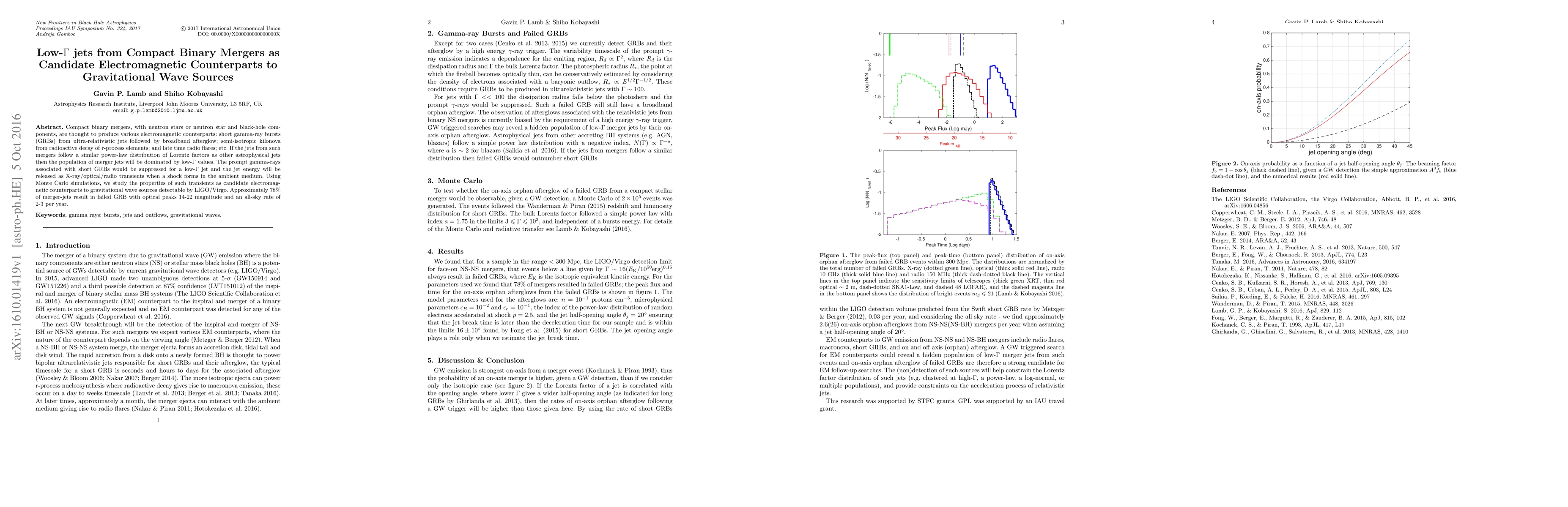 This paper investigates electromagnetic counterparts from compact binary mergers, finding that low-Γ jets dominate the population. These jets produce X-ray/optical/radio transients instead of short gamma-ray bursts, with an estimated all-sky rate of 2-3 per year.