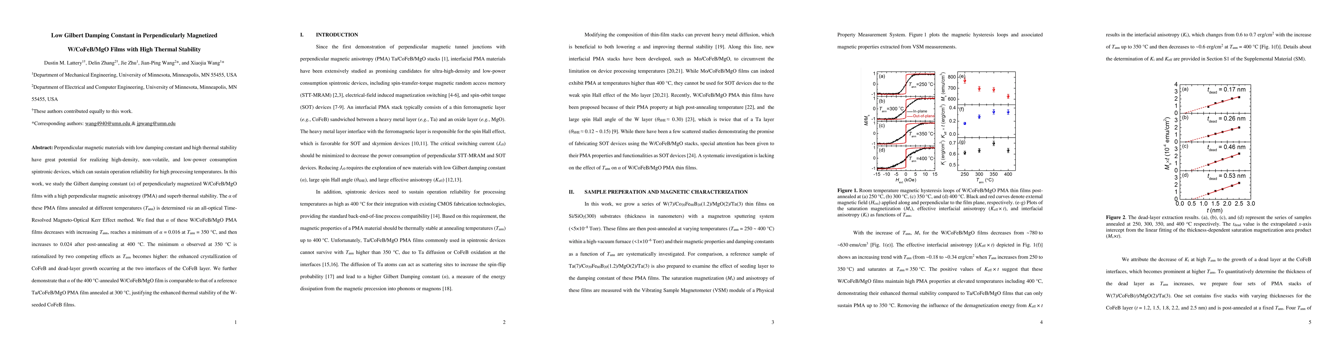 This paper investigates the Gilbert damping constant in W/CoFeB/MgO films with high perpendicular magnetic anisotropy and thermal stability, finding that the damping constant decreases with annealing temperature up to 350°C, reaching a minimum of 0.016, before increasing at higher temperatures. The enhanced thermal stability and low damping are attributed to improved crystallization and interface effects.