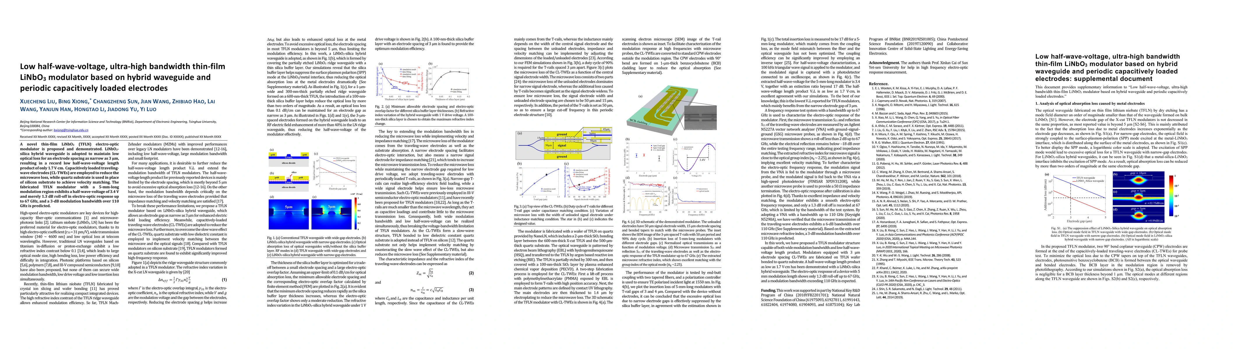 This paper proposes a novel thin-film LiNbO3 electro-optic modulator with a hybrid waveguide and capacitively loaded electrodes, achieving a record low half-wave-voltage length product of 1.7 V*cm and a 3-dB modulation bandwidth exceeding 110 GHz. The design utilizes LiNbO3-silica hybrid waveguides and quartz substrates for low optical loss and velocity matching.