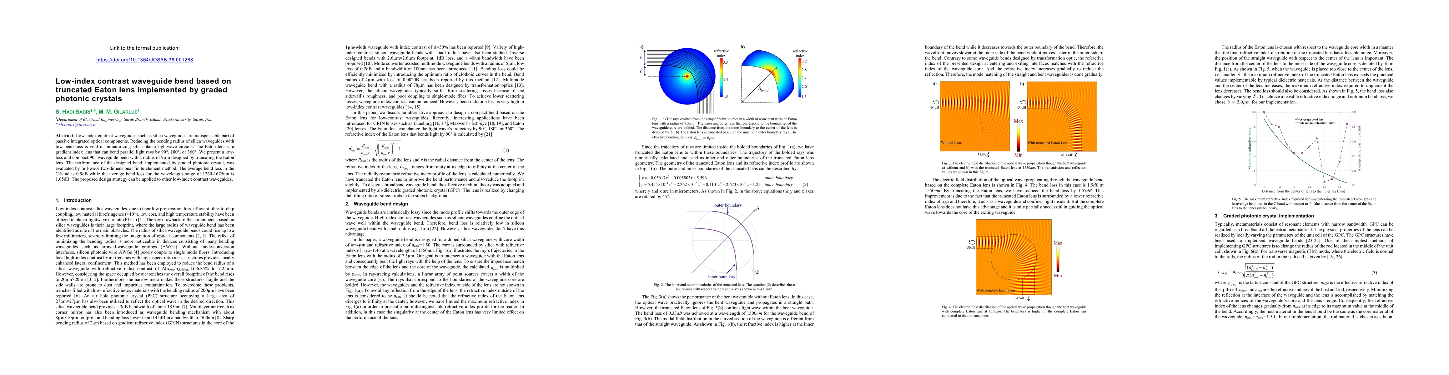 This research presents a low-loss, compact 90° waveguide bend with a small radius of 9 µm, achieved by truncating an Eaton lens and implementing it using graded photonic crystals. The design achieves an average bend loss of 0.9 dB in the C-band and 1.05 dB over a wide wavelength range, offering a viable strategy for miniaturizing silica planar lightwave circuits.