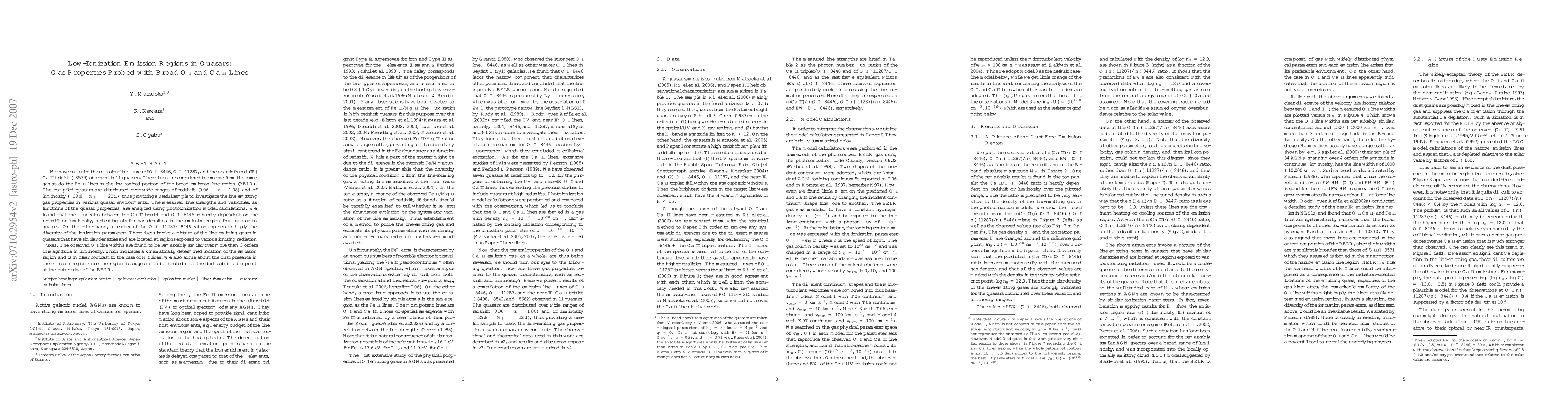 This study investigates the gas properties in low-ionization emission regions of quasars using O I and Ca II lines, finding similar gas densities across quasars but diverse ionization parameters. The observed line widths suggest a uniform kinematic location for the emission region, contrasting with H I lines.