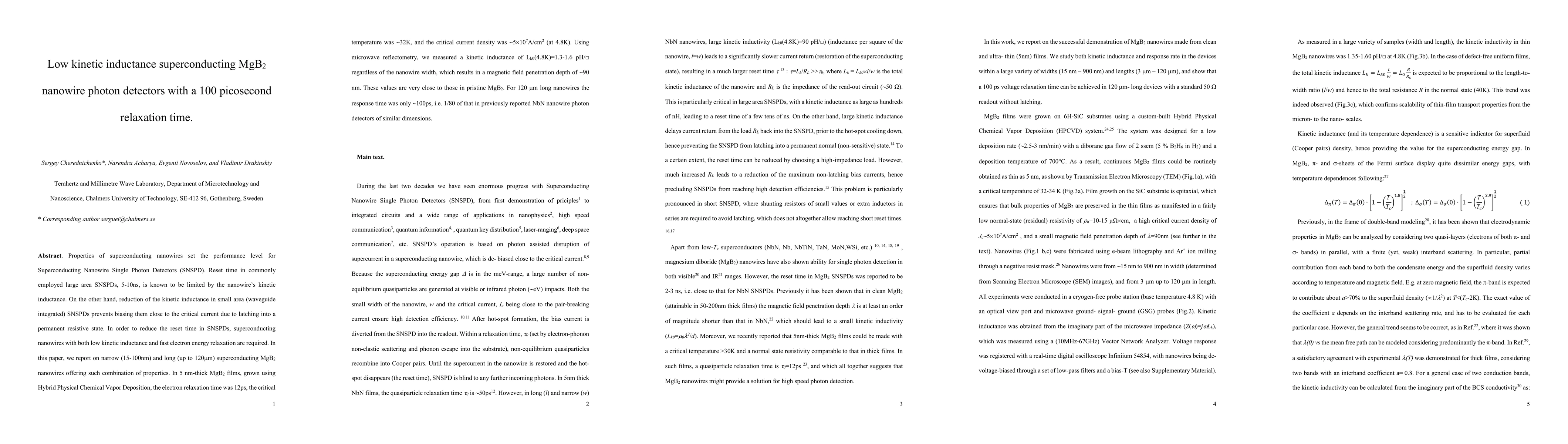 Researchers developed MgB2 nanowire photon detectors with low kinetic inductance and fast electron relaxation time, achieving a response time of 100ps for 120um long nanowires.