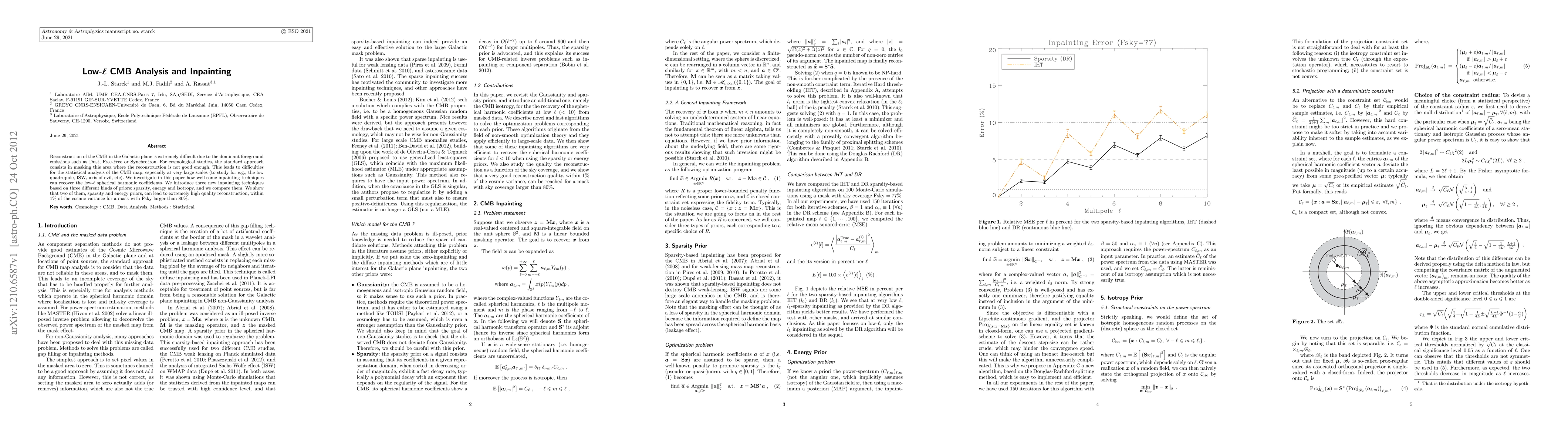 Reconstruction of the CMB in the Galactic plane is extremely difficult due to the dominant foreground emissions such as Dust, Free-Free or Synchrotron. For cosmological studies, the standard approach consists in masking this area where the reconstruction is not good enough. This leads to difficulties for the statistical analysis of the CMB map, especially at very large scales (to study for e.g., the low quadrupole, ISW, axis of evil, etc). We investigate in this paper how well some inpainting techniques can recover the low-$\ell$ spherical harmonic coefficients. We introduce three new inpainting techniques based on three different kinds of priors: sparsity, energy and isotropy, and we compare them. We show that two of them, sparsity and energy priors, can lead to extremely high quality reconstruction, within 1% of the cosmic variance for a mask with Fsky larger than 80%.