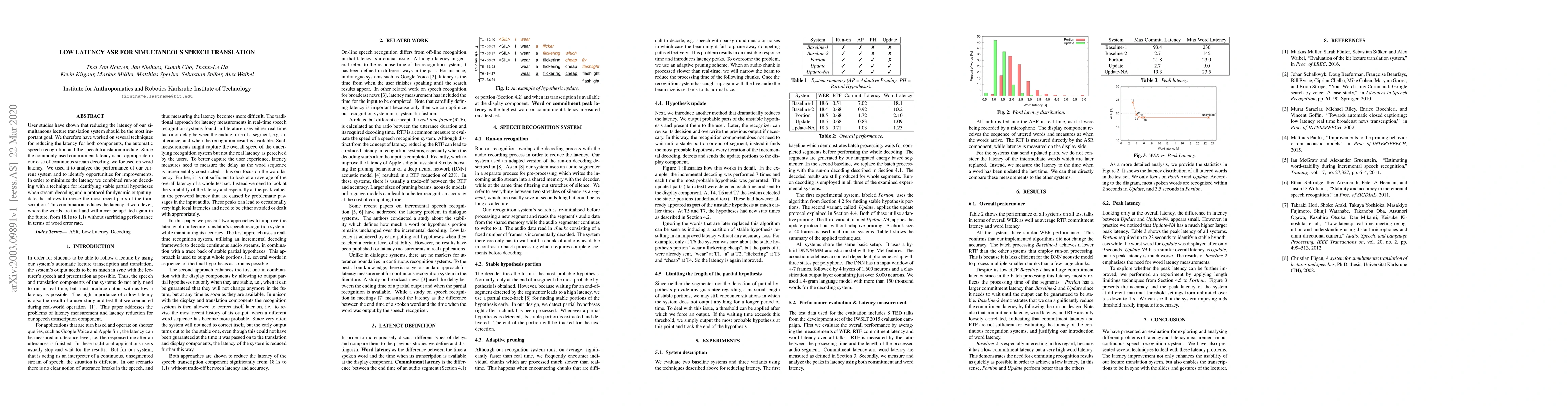 This paper presents techniques to reduce latency in a simultaneous lecture translation system, focusing on automatic speech recognition and speech translation. The authors combine run-on decoding, stable partial hypothesis identification, and dynamic output update to reduce word latency from 18.1s to 1.1s without compromising word error rate.
