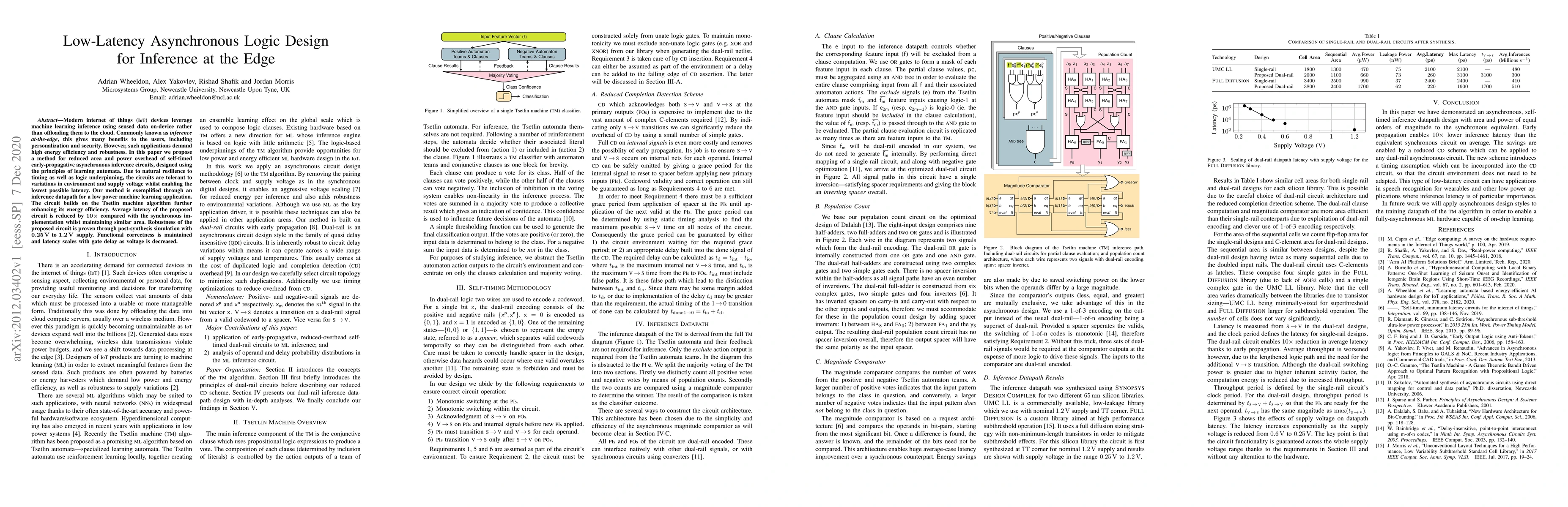 This paper proposes an asynchronous logic design for low-latency inference at the edge, leveraging self-timed early-propagative circuits based on learning automata principles. The method achieves significant reductions in latency and power consumption, maintaining robustness across varying supply voltages, and demonstrates a 10x reduction in average latency compared to synchronous implementations.