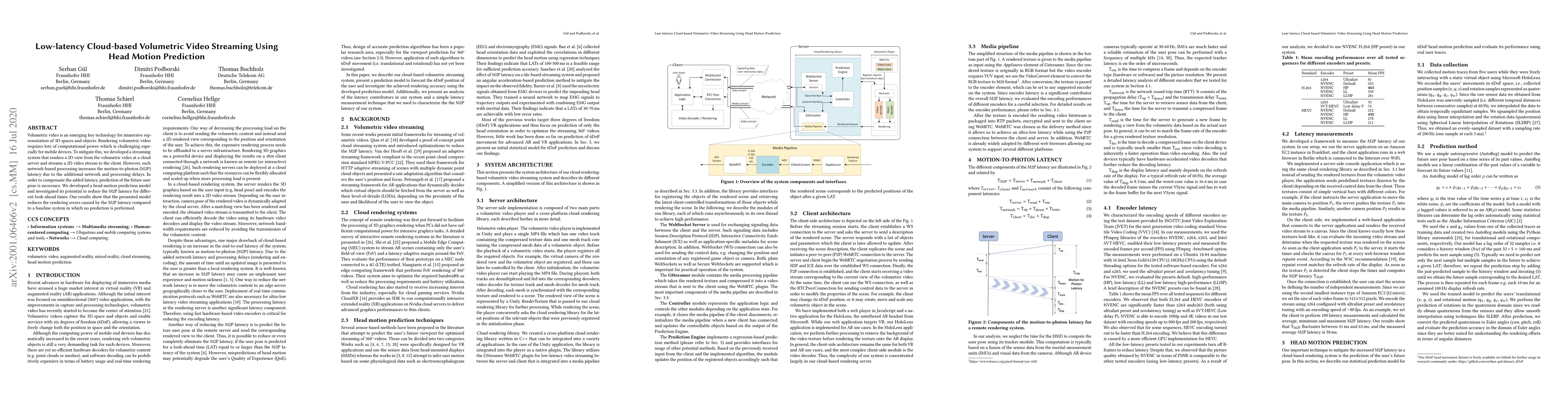 This paper presents a cloud-based streaming system for volumetric video that renders 2D views at a server to reduce mobile device computation. To mitigate increased latency from network delays, the authors developed a head motion prediction model, showing it effectively reduces rendering errors compared to a baseline system without prediction.