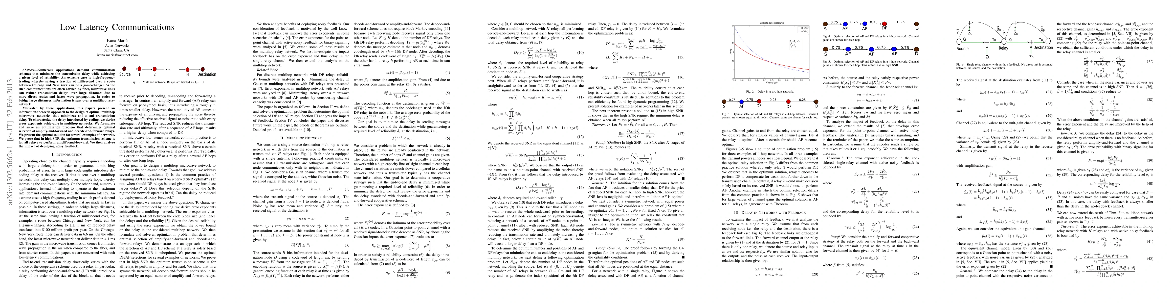 Numerous applications demand communication schemes that minimize the transmission delay while achieving a given level of reliability. An extreme case is high-frequency trading whereby saving a fraction of millisecond over a route between Chicago and New York can be a game-changer. While such communications are often carried by fiber, microwave links can reduce transmission delays over large distances due to more direct routes and faster wave propagation. In order to bridge large distances, information is sent over a multihop relay network. Motivated by these applications, this papers present an information-theoretic approach to the design of optimal multihop microwave networks that minimizes end-to-end transmission delay. To characterize the delay introduced by coding, we derive error exponents achievable in multihop networks. We formulate and solve an optimization problem that determines optimal selection of amplify-and-forward and decode-and-forward relays. We present the optimal solution for several examples of networks. We prove that in high SNR the optimum transmission scheme is for all relays to perform amplify-and-forward. We then analyze the impact of deploying noisy feedback
