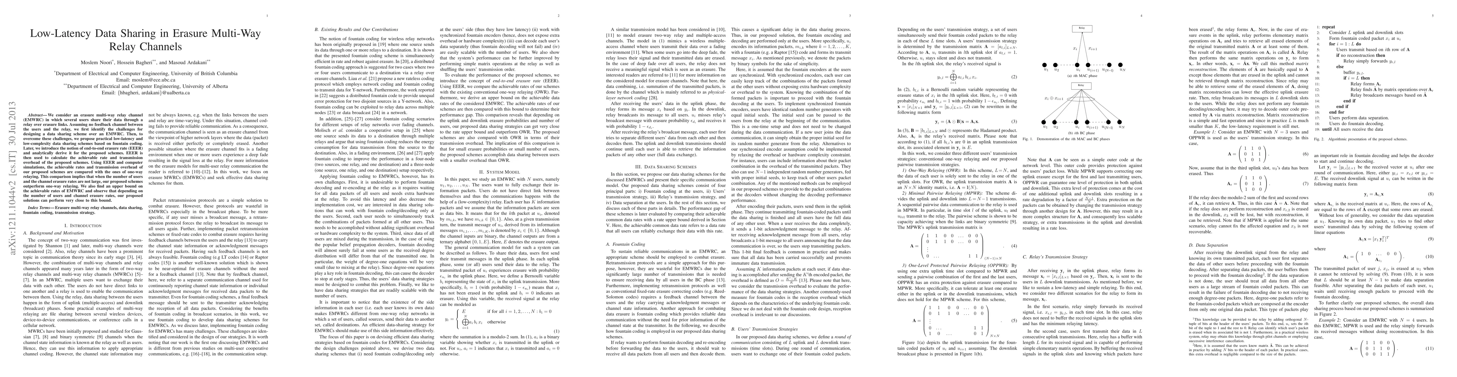 This research proposes low-latency data sharing schemes using fountain coding for erasure multi-way relay channels, outperforming one-way relaying when user count and erasure rates aren't large. It introduces end-to-end erasure rate (EEER) for analysis, showing proposed solutions can approach the EMWRC rate upper bound based on user number and erasure rates.