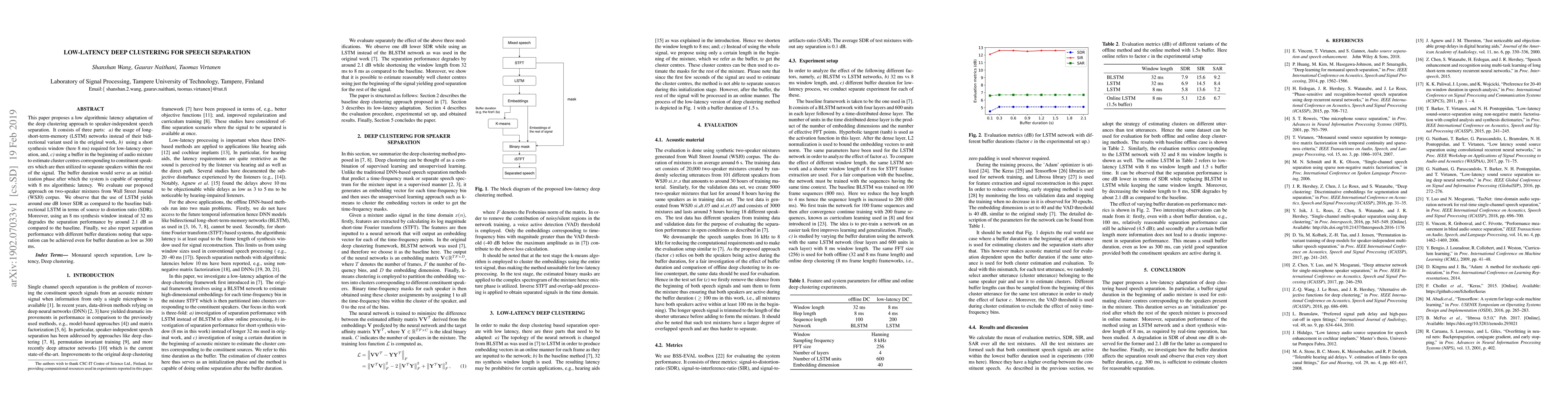 This research paper proposes a low-latency adaptation of deep clustering for speech separation using LSTM networks and a short synthesis window. The method includes an initialization phase with a buffer to estimate speaker clusters, achieving an 8 ms algorithmic latency. Evaluations on WSJ0 data show a trade-off in separation performance due to the reduced synthesis window and LSTM usage. For further details, please refer to the original paper.