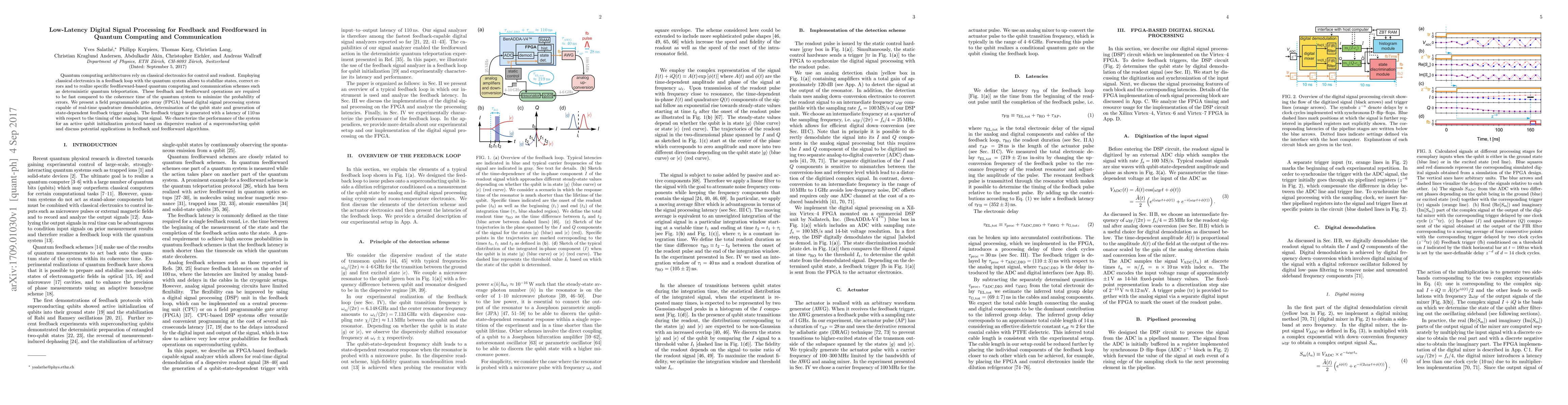 Quantum computing architectures rely on classical electronics for control and readout. Employing classical electronics in a feedback loop with the quantum system allows to stabilize states, correct errors and to realize specific feedforward-based quantum computing and communication schemes such as deterministic quantum teleportation. These feedback and feedforward operations are required to be fast compared to the coherence time of the quantum system to minimize the probability of errors. We present a field programmable gate array (FPGA) based digital signal processing system capable of real-time quadrature demodulation, determination of the qubit state and generation of state-dependent feedback trigger signals. The feedback trigger is generated with a latency of $110\,\mathrm{ns}$ with respect to the timing of the analog input signal. We characterize the performance of the system for an active qubit initialization protocol based on dispersive readout of a superconducting qubit and discuss potential applications in feedback and feedforward algorithms.