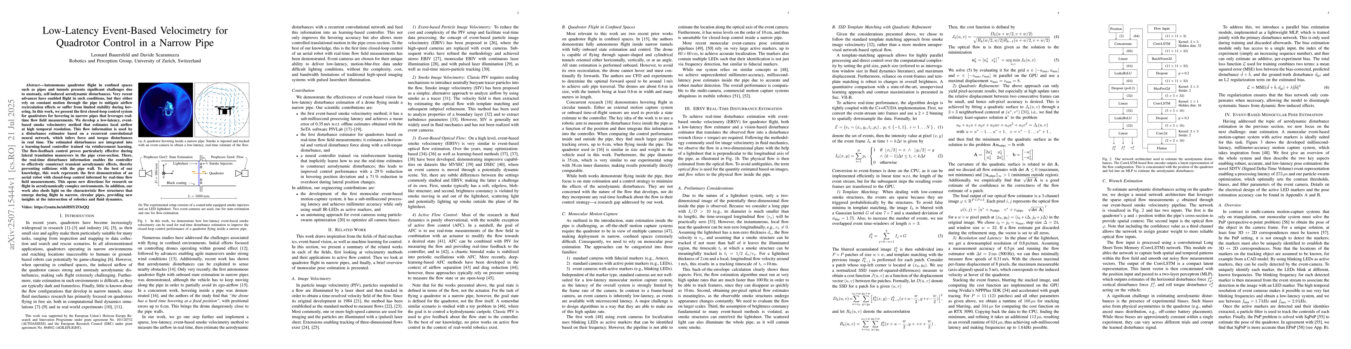 The research presents a low-latency, event-based smoke velocimetry method for real-time flow field measurements in narrow pipes, utilizing a recurrent convolutional neural network (RCNN) for disturbance estimation and a reinforcement learning-based controller for quadrotor control.