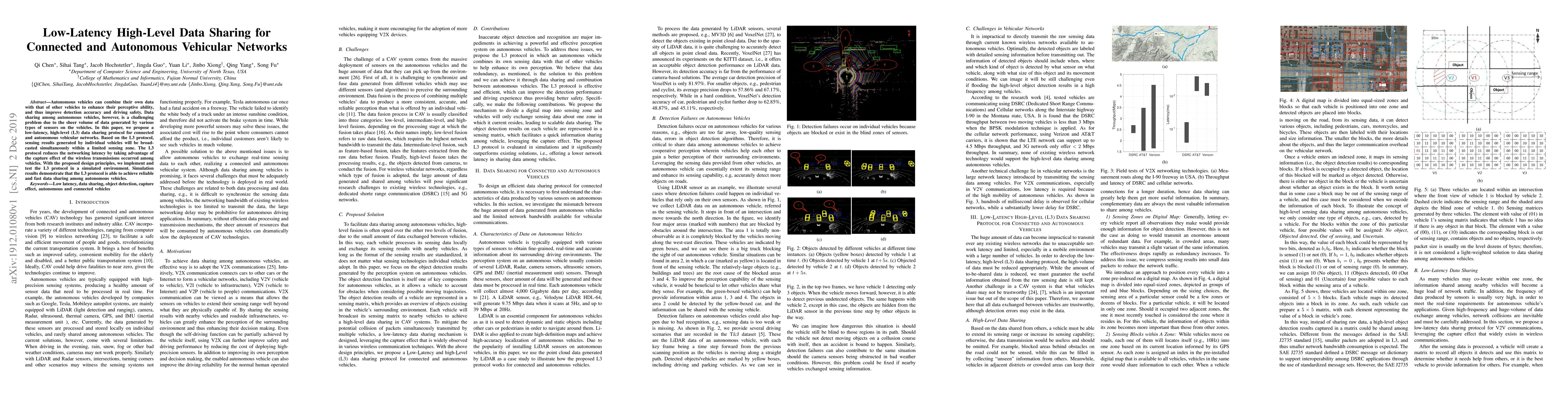 Autonomous vehicles can combine their own data with that of other vehicles to enhance their perceptive ability, and thus improve detection accuracy and driving safety. Data sharing among autonomous vehicles, however, is a challenging problem due to the sheer volume of data generated by various types of sensors on the vehicles. In this paper, we propose a low-latency, high-level (L3) data sharing protocol for connected and autonomous vehicular networks. Based on the L3 protocol, sensing results generated by individual vehicles will be broadcasted simultaneously within a limited sensing zone. The L3 protocol reduces the networking latency by taking advantage of the capture effect of the wireless transmissions occurred among vehicles. With the proposed design principles, we implement and test the L3 protocol in a simulated environment. Simulation results demonstrate that the L3 protocol is able to achieve reliable and fast data sharing among autonomous vehicles.