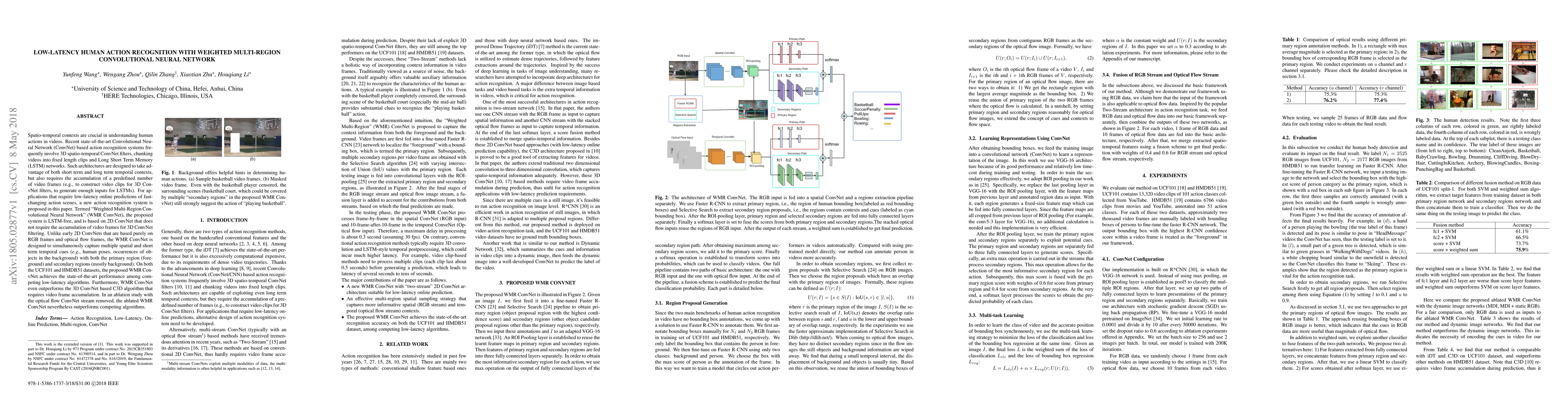 The paper proposes a Weighted Multi-Region Convolutional Neural Network (WMR ConvNet) for low-latency human action recognition, utilizing 2D ConvNets without frame accumulation for 3D filtering. It extracts primary (foreground) and secondary (background) regions using Faster R-CNN and Selective Search, respectively, and fuses their scores for classification.