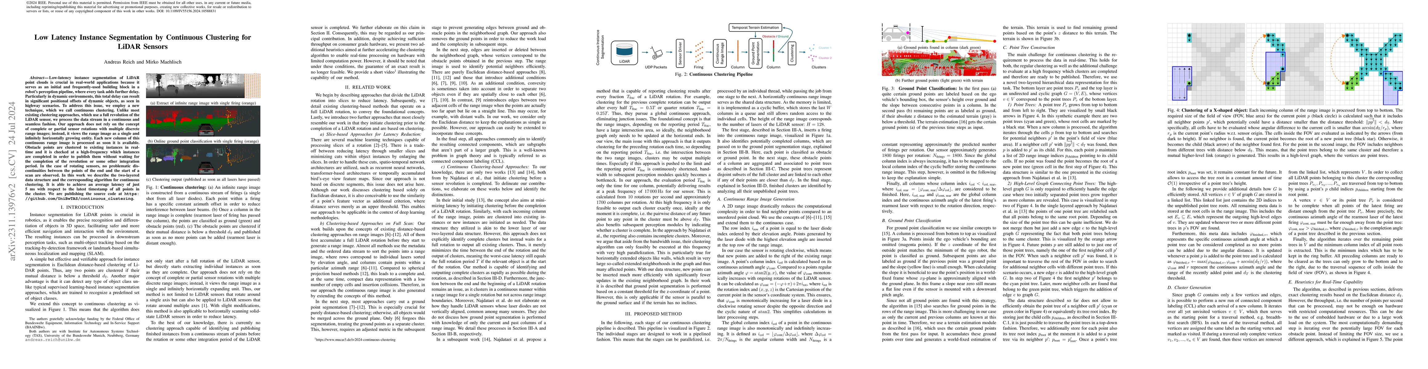 This paper proposes a method for low-latency instance segmentation of LiDAR point clouds using continuous clustering, processing data in real-time without waiting for a full sensor revolution. The approach clusters obstacle points into instances seamlessly, minimizing delays and discontinuities, and is designed to enhance real-time perception in dynamic environments.