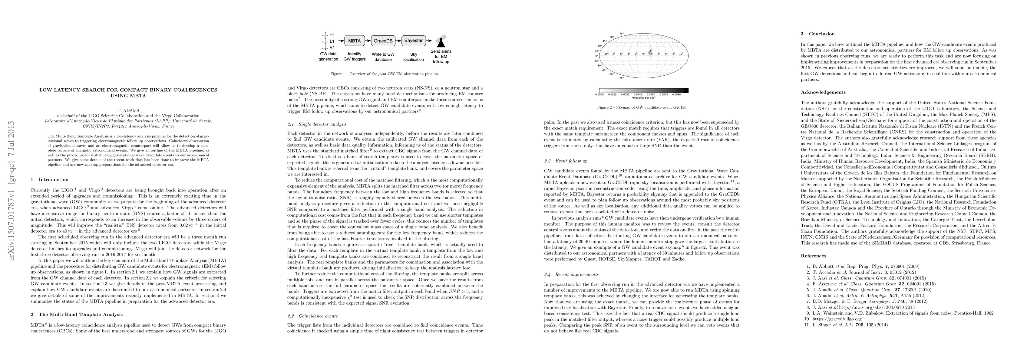 The Multi-Band Template Analysis is a low-latency analysis pipeline for the detection of gravitational waves to triggering electromagnetic follow up observations. Coincident observation of gravitational waves and an electromagnetic counterpart will allow us to develop a complete picture of energetic astronomical events. We give an outline of the MBTA pipeline, as well as the procedure for distributing gravitational wave candidate events to our astronomical partners. We give some details of the recent work that has been done to improve the MBTA pipeline and are now making preparations for the advanced detector era.