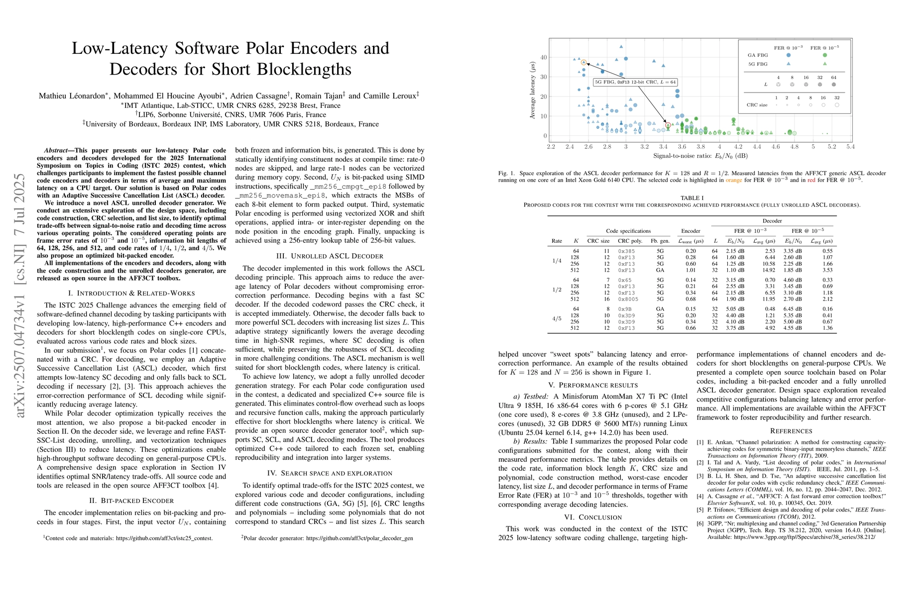 This paper presents our low-latency Polar code encoders and decoders developed for the 2025 International Symposium on Topics in Coding (ISTC 2025) contest, which challenges participants to implement the fastest possible channel code encoders and decoders in terms of average and maximum latency on a CPU target. Our solution is based on Polar codes with an Adaptive Successive Cancellation List (ASCL) decoder. We introduce a novel ASCL unrolled decoder generator. We conduct an extensive exploration of the design space, including code construction, CRC selection, and list size, to identify optimal trade-offs between signal-to-noise ratio and decoding time across various operating points. The considered operating points are frame error rates of 10^{-3} and 10^{-5}, information bit lengths of 64, 128, 256, and 512, and code rates of 1/4, 1/2, and 4/5. We also propose an optimized bit-packed encoder. All implementations of the encoders and decoders, along with the code construction and the unrolled decoders generator, are released as open source in the AFF3CT toolbox.