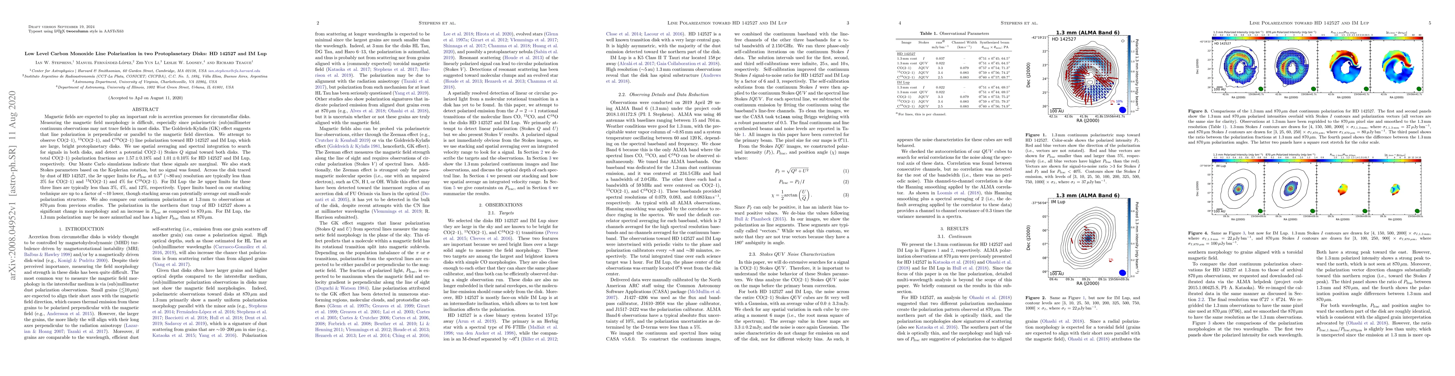 This study investigates low-level carbon monoxide line polarization in the protoplanetary disks HD 142527 and IM Lup to infer magnetic field morphology. Marginal polarization signals were detected, with polarization fractions of 1.57% and 1.01% for HD 142527 and IM Lup, respectively, suggesting complex magnetic field interactions.