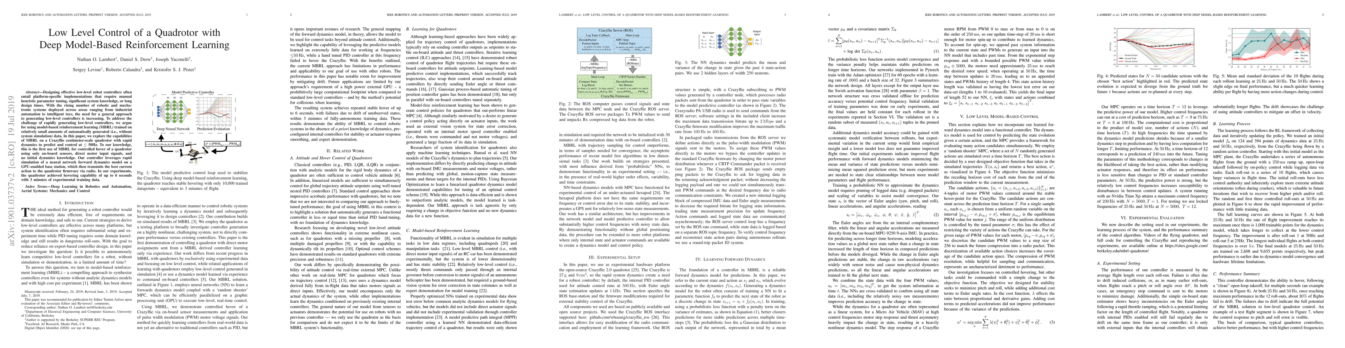 This paper proposes using model-based reinforcement learning (MBRL) to rapidly generate low-level controllers for quadrotors, specifically for hover control of a Crazyflie quadrotor. The approach leverages a neural network forward dynamics model trained on minimal on-board sensor data, achieving hover capabilities with up to 6 seconds of stability using only 3 minutes of training data.