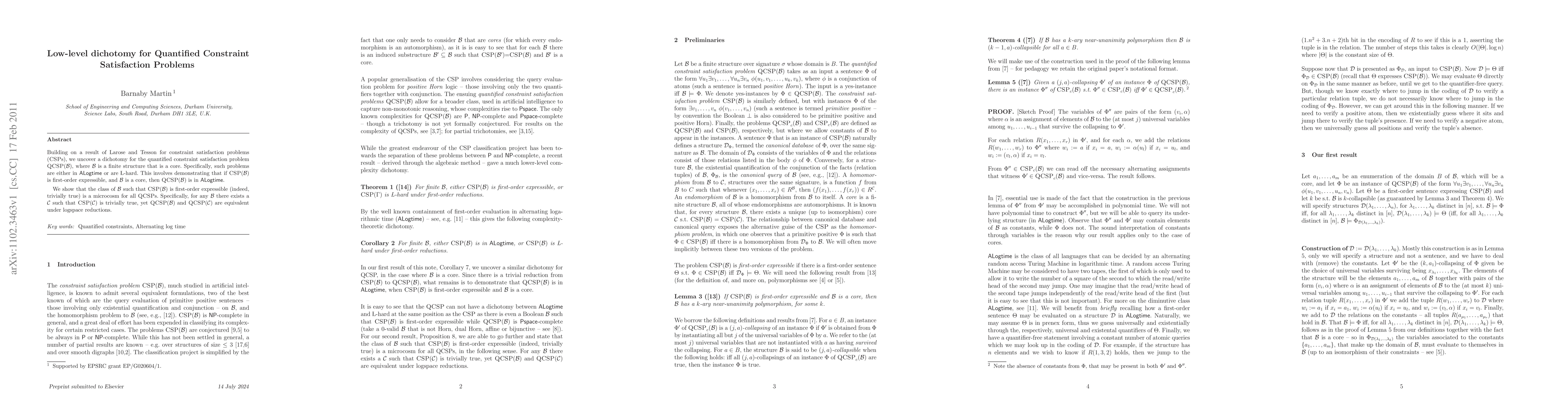The paper presents a low-level dichotomy theorem for QCSP(B) and demonstrates logspace verifiability of first-order sentences on cores.