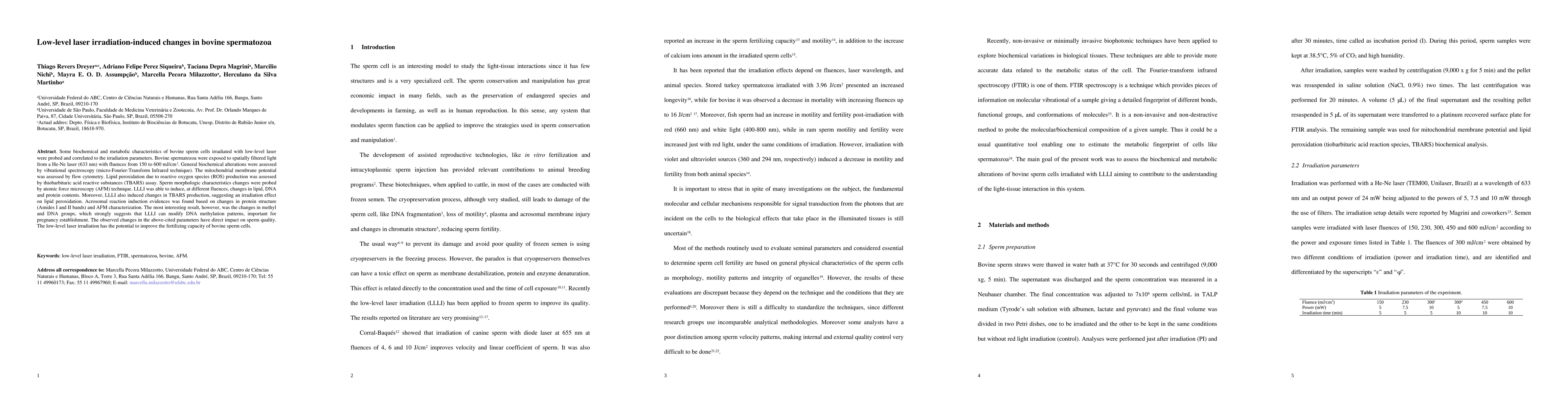 Some biochemical and metabolic characteristics of bovine sperm cells irradiated with low-level laser were probed and correlated to the irradiation parameters. Bovine spermatozoa were exposed to spatially filtered light from a He-Ne laser (633 nm) with fluences from 150 to 600 mJ/cm2. General biochemical alterations were assessed by vibrational spectroscopy (micro-Fourier-Transform Infrared technique). The mitochondrial membrane potential was assessed by flow cytometry. Lipid peroxidation due to reactive oxygen species (ROS) production was assessed by thiobarbituric acid reactive substances (TBARS) assay. Sperm morphologic characteristics changes were probed by atomic force microscopy (AFM) technique. LLLI was able to induce, at different fluences, changes in lipid, DNA and protein contents. Moreover, LLLI also induced changes in TBARS production, suggesting an irradiation effect on lipid peroxidation. Acrosomal reaction induction evidences was found based on changes in protein structure (Amides I and II bands) and AFM characterization. The most interesting result, however, was the changes in methyl and DNA groups, which strongly suggests that LLLI can modify DNA methylation patterns, important for pregnancy establishment. The observed changes in the above-cited parameters have direct impact on sperm quality. The low-level laser irradiation has the potential to improve the fertilizing capacity of bovine sperm cells.