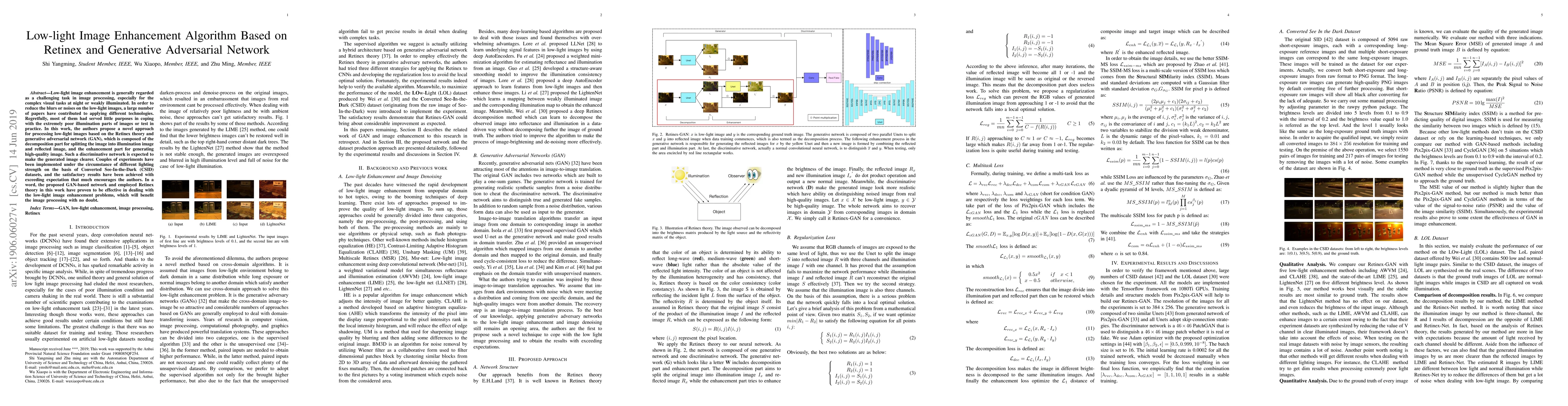 Low-light image enhancement is generally regarded as a challenging task in image processing, especially for the complex visual tasks at night or weakly illuminated. In order to reduce the blurs or noises on the low-light images, a large number of papers have contributed to applying different technologies. Regretfully, most of them had served little purposes in coping with the extremely poor illumination parts of images or test in practice. In this work, the authors propose a novel approach for processing low-light images based on the Retinex theory and generative adversarial network (GAN), which is composed of the decomposition part for splitting the image into illumination image and reflected image, and the enhancement part for generating high-quality image. Such a discriminative network is expected to make the generated image clearer. Couples of experiments have been implemented under the circumstance of different lighting strength on the basis of Converted See-In-the-Dark (CSID) datasets, and the satisfactory results have been achieved with exceeding expectation that much encourages the authors. In a word, the proposed GAN-based network and employed Retinex theory in this work have proven to be effective in dealing with the low-light image enhancement problems, which will benefit the image processing with no doubt.
