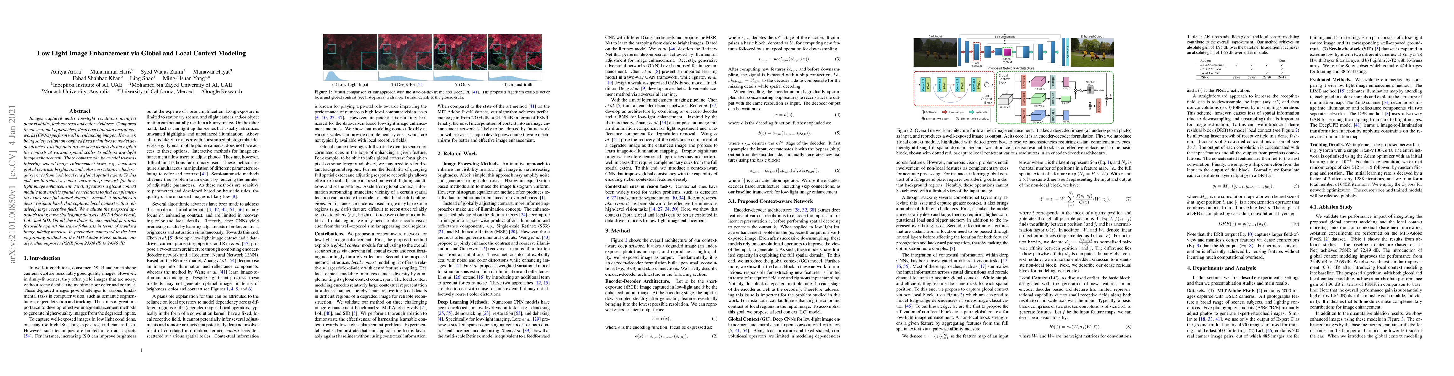 This paper proposes a deep convolutional neural network with global and local context modeling to enhance low-light images, achieving better performance than state-of-the-art methods by incorporating both global and local spatial contexts. The method improves PSNR by 1.41 dB on the MIT-Adobe FiveK dataset compared to the best existing method.