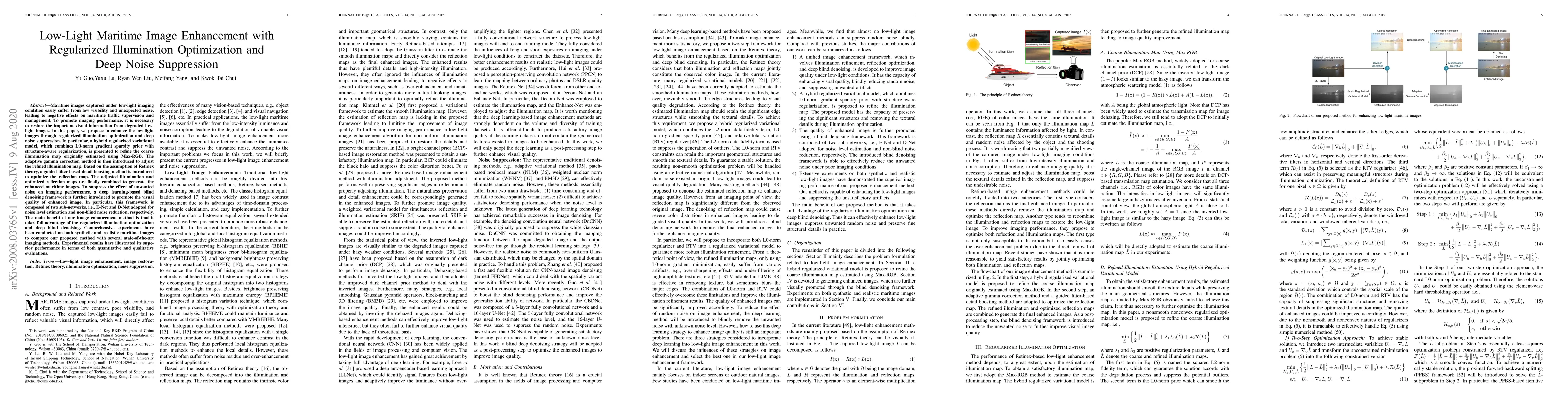 This paper proposes a method for enhancing low-light maritime images through regularized illumination optimization and deep noise suppression, combining a hybrid variational model with adaptive gamma correction and a guided filter-based detail boosting method, followed by a deep learning-based blind denoising framework for improved visual quality. Experimental results show superior performance compared to state-of-the-art methods.