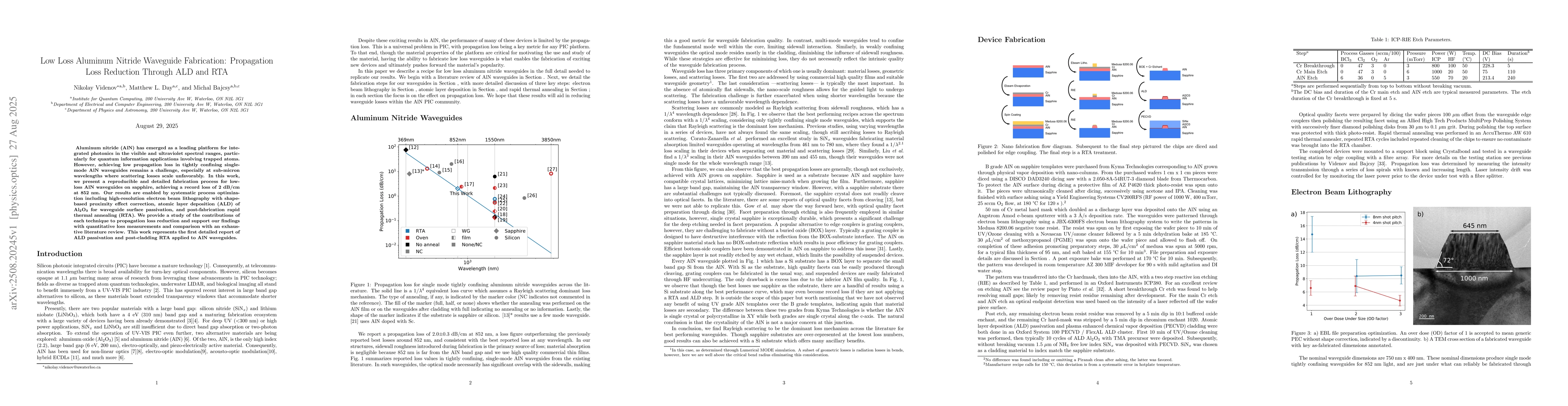 Aluminum nitride (AlN) has emerged as a leading platform for integrated photonics in the visible and ultraviolet spectral ranges, particularly for quantum information applications involving trapped atoms. However, achieving low propagation loss in tightly confining single-mode AlN waveguides remains a challenge, especially at sub-micron wavelengths where scattering losses scale unfavorably. In this work, we present a reproducible and detailed fabrication process for low-loss AlN waveguides on sapphire, achieving a record loss of 2~dB/cm at 852~nm. Our results are enabled by systematic process optimization including high-resolution electron beam lithography with shape-based proximity effect correction, atomic layer deposition (ALD) of \ce{Al2O3} for waveguide surface passivation, and post-fabrication rapid thermal annealing (RTA). We provide a study of the contributions of each technique to propagation loss reduction and support our findings with quantitative loss measurements and comparison with an exhaustive literature review. This work represents the first detailed report of ALD passivation and post-cladding RTA applied to AlN waveguides.