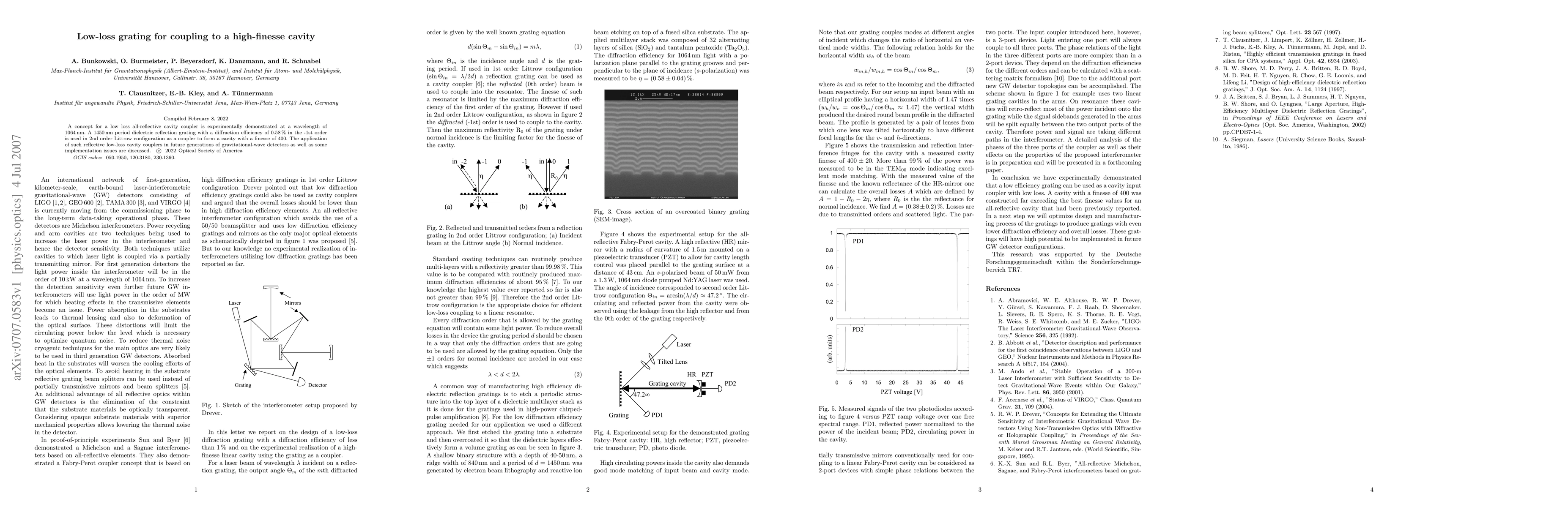 Researchers demonstrated a low-loss cavity coupler using a 1450 nm period grating at 1064 nm wavelength, achieving a finesse of 400 in a high-finesse cavity.